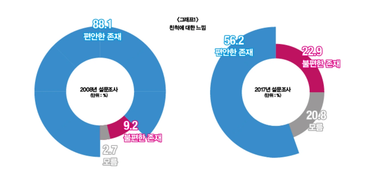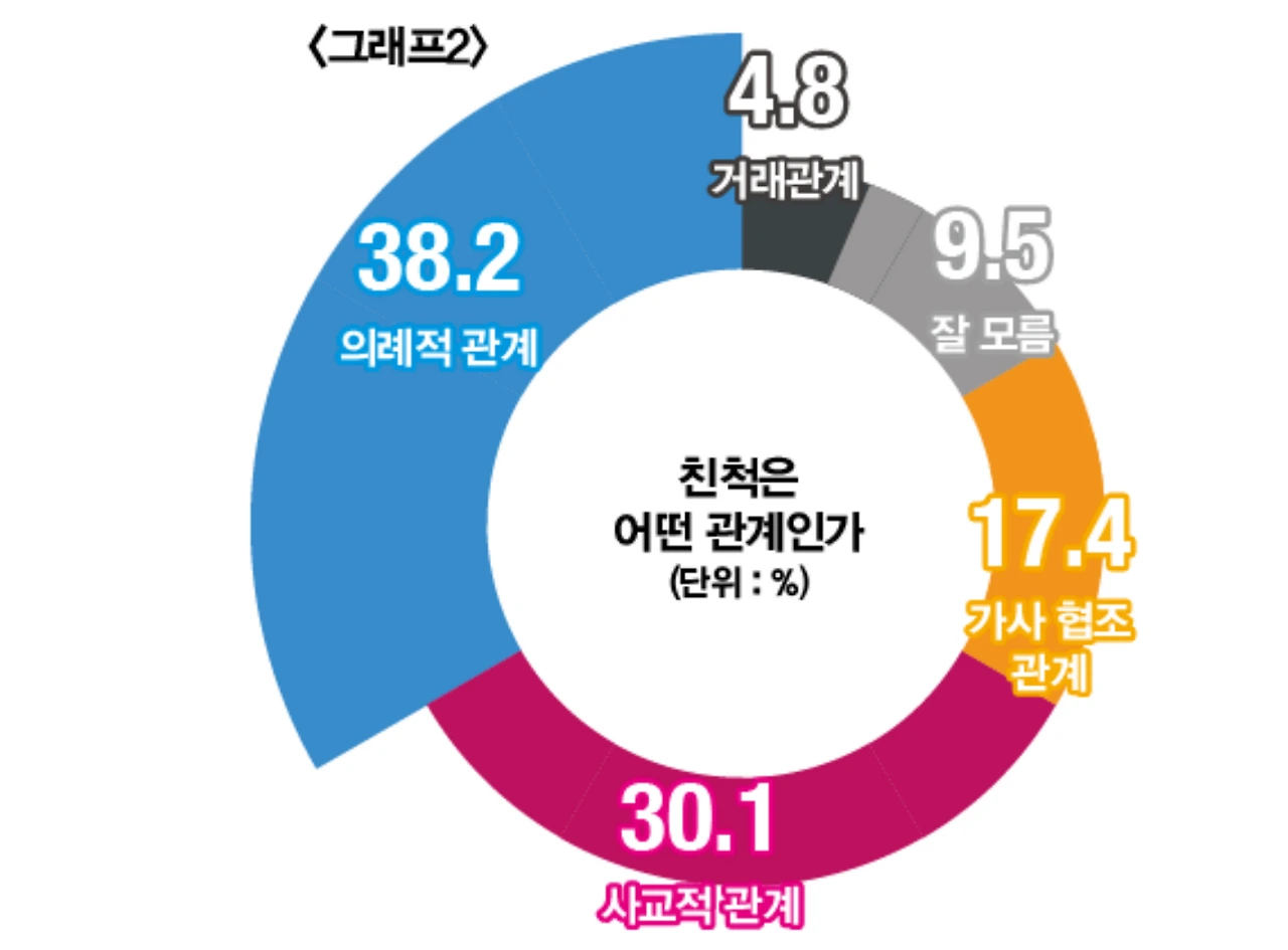 2017년의 통계자료이다. 친척을 사교적 관계로 생각하는 사람보다 명절이나 제사와 같은 가족 행사 때만 보는 의례적인 관계로 바라보는 시각이 많아졌다는 자료이다.