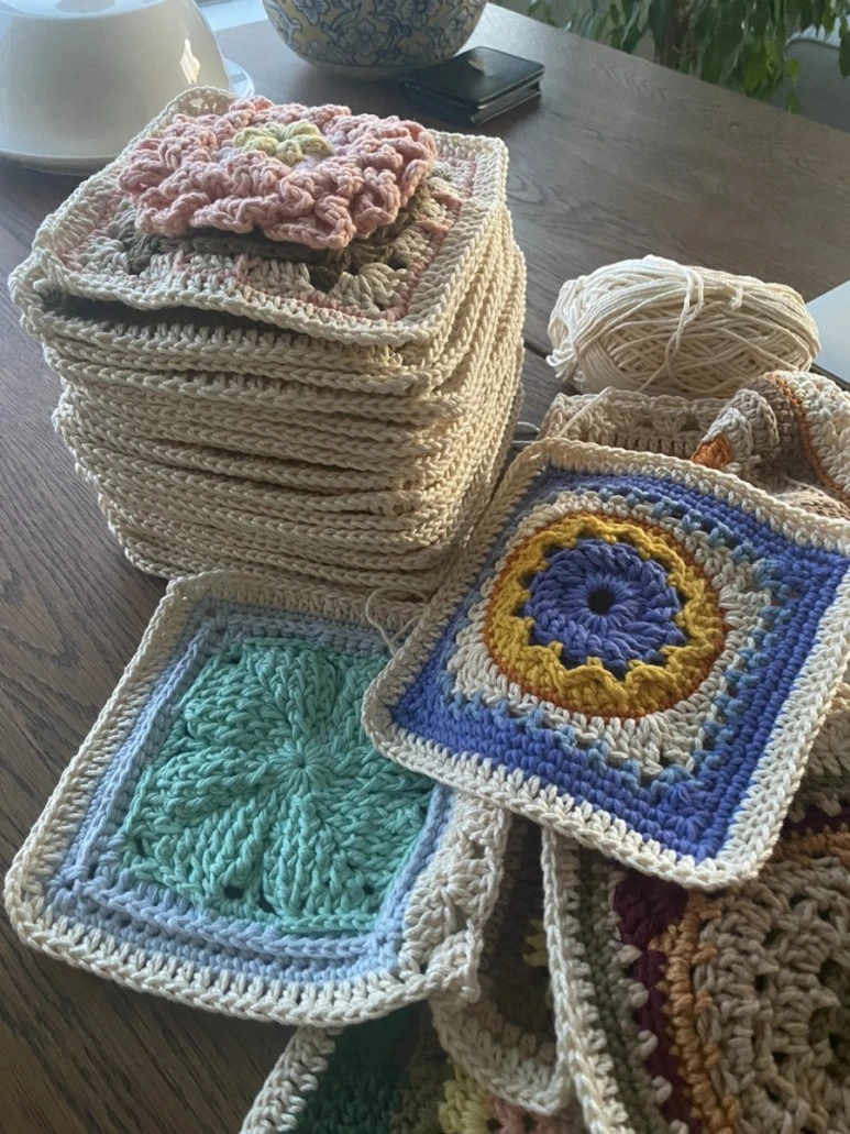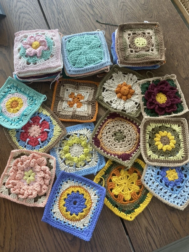사실은, 각각 다른 색의 25g짜리 20개 묶음으로 된 실을 샀더니 색감이 별로 마음에 들지 않는 것도 있었다 그래서 정작 뜨는 건 쉽고 재밌는데 색깔을 매치할 때 많이 망설였고, 꽤 여러 장의 모티프는 완성 후에도 마음에 들지 않아서 아쉽기도 했다.