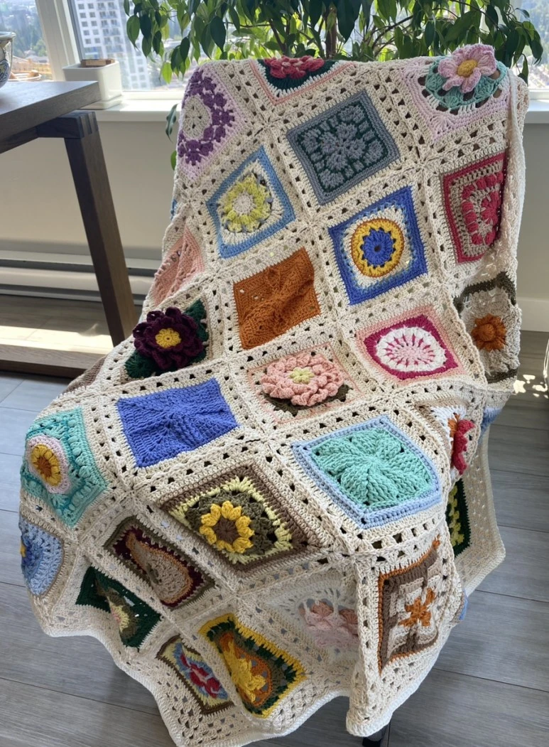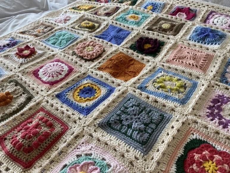 그러다 마침 아이의 생일이 다가오기도 해서 선물 겸, 이왕이면 좀 큰 프로젝트(?)를 해 볼까 싶어서 담요를 떠주기로 했다. 하지만 모티프마다 같은 문양에 색상 조합만 바꾼 게 아니라 좀 다양하고 독특한 걸로 뜨고 싶어서 책을 살까 망설이던 중에 우연히 유튜브에서 마음에 쏙 드는 사이트를 발견했다. 한국에 사시는 분인데 내가 살까 말까 망설였던 책에 있는 모티프중에서 골라 하나씩 뜨는 과정을 올려놓은 것이었다. ‘함께하는 뜨개질[캣츠, 룸]이라는 곳인데, 나는 이미 갖고 있는 실 만으로 떠서 색깔 조합은 완전히 달라졌지만 정말 도움이 많이 되었다. 세 권의 책에서 골라 올려준 덕분에 책을 사지 않고도 꽤 다양한 모티프를 뜰 수 있었다