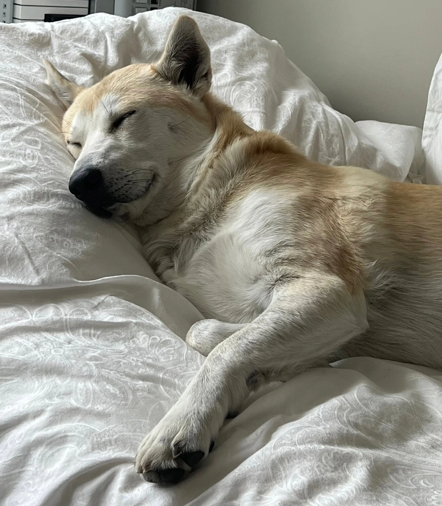 중대형견들의 적당한 수면 시간은 16~18시간이라고 한다. 좀 많다고 생각했는데 깨어있을 때 워낙 모든 감각이 초집중 상태이니 그 정도는 자야 에너지를 회복할 수 있나 보다. 그래선지 헌터도 평소에 잠을 많이 자는 편인데 특히 비 오는 날엔 더 잘 잔다. 비를 싫어하면서도 비오는 날의 아늑한 분위기는 좋아하니 다행이다. 폭신한 침대에 푹 파묻혀서 온몸에 힘을 다 빼고 옆으로 누워 자는 모습을 보면 부럽기까지 하다. 방해하지 말아야 하는데 그 모습이 예뻐서 슬쩍 쓰다듬어 주면 눈을 뜨고 확인한 다음에 한숨까지 내쉬며 다시 더 깊은 잠에 빠진다. 그 한숨소리는, 듣는 우리까지 평화롭게 만든다.