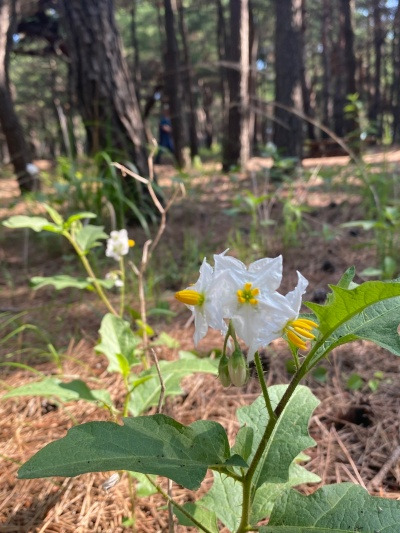 시들어 떨어진 솔잎이 쌓여 늘 붉어보이던 숲길에도 여름이 다가올 수록 점점 더 초록이 넓어진다. 하지만 햇볕이 잘 들지 않아선지 꽃은 거의 없다. 드문드문 피어난 쑥부쟁이가 반가울 정도다. 갯완두의 보랏빛, 갯메꽃의 연한 분홍으로 시작해 노란꽃이 많은 해변의 야생화를 떠올리면 지척의 거리인데도 사뭇 다르다. 이쪽 송림은 묵묵하다. 그런데 어느 날, 꽤 크고 흰 꽃이 보이기 시작했다. 마치 그늘 속을 비추는 햇살처럼 환하고 예뻤지만 의외기도 했다. 보자마자 바로 감자꽃이 떠올랐기 때문이다. 내 얕은 상식으로도 감자는 씨감자를 쪼개서 심는다는 걸 알았기에 이렇게 야생에서 감자가 자란다는 게 의심스러웠다. 그러면서도 이미 '감자꽃을 보았네'가 입력되었다. 하지만 미심쩍은 건 발설하기 전에 확인을 해야지.