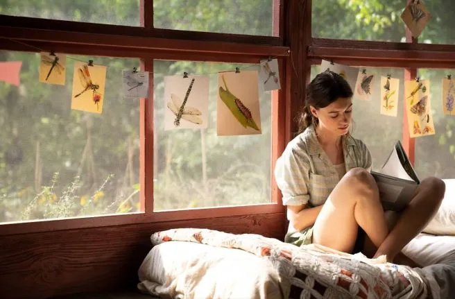 사실 초반엔 살짝 당황했다. 영화의 전체적인 색조의 무게감과 설정이 책보다 지나치게 밝고 '살만하게' 보였기 때문이다. 극적인 성장 스토리를 위해 필요했던 가정폭력과 불안하고 배고프고 외로운 상황들이 마치 표정을 바꾸고 딴 사람인척하는 것처럼 보였다. 하지만 이내 이어지는 아름다운 장면의 유혹에 빠진 나는 영화를 보는 동안 책은 별로 생각나지 않았다. 오히려 책을 읽으며 힘들었던 마음이 치유되는 것 같기도 했다. 너무나 마음을 아프게 했던 어린 카야가 나의 상상보다는 훨씬 덜 힘들고 덜 불행해 보여서 좋았고, 성장한 카야 역의 '데이지 에드가 존슨'이 너무 아름다워서 뿌듯하기까지 했다. 심지어 책을 읽을 땐, 거기서 어떻게 밥을 먹고 잠을 자며 살았을까 싶었던 부엌과 침실마저 너무 예쁘고 내 취향이라 다른 스토리를 보는 것 같은 착각마저도 이질감이 되진 못했다. 특히 습지의 아름다운 풍경보다 더욱 마음을 끌었던 장면은 바로 카야의 침실 겸 작업실이었다. 카야는 가족들이 모두 떠나고 난 후 홀로 남았을 때 어둠이 주는 무서움을 극복하기 위해서 포치로 매트리스를 끌고 와서 잔다. 기역 자로 된 유리벽으로 달빛이 내려오는 마당과 습지가 보이고 아마 풀벌레 소리도 들렸을 것이다. 이후로 카야는 이곳에서 계속 생활하는데 그녀가 습지 식물과 동물들을 관찰하면서 그린 정밀화들이 가득 붙어있는 그 방은 너무나 예뻤고, 아무리 외롭고 거친 생활을 하더라도 변하지 않을 카야의 본성과 내면을 나타내는 것 같아서 볼때마다 안심이 되었다.