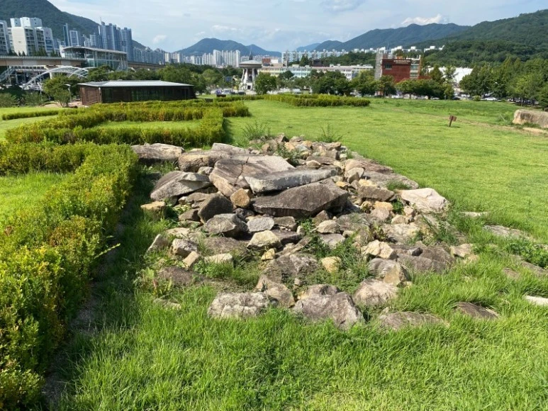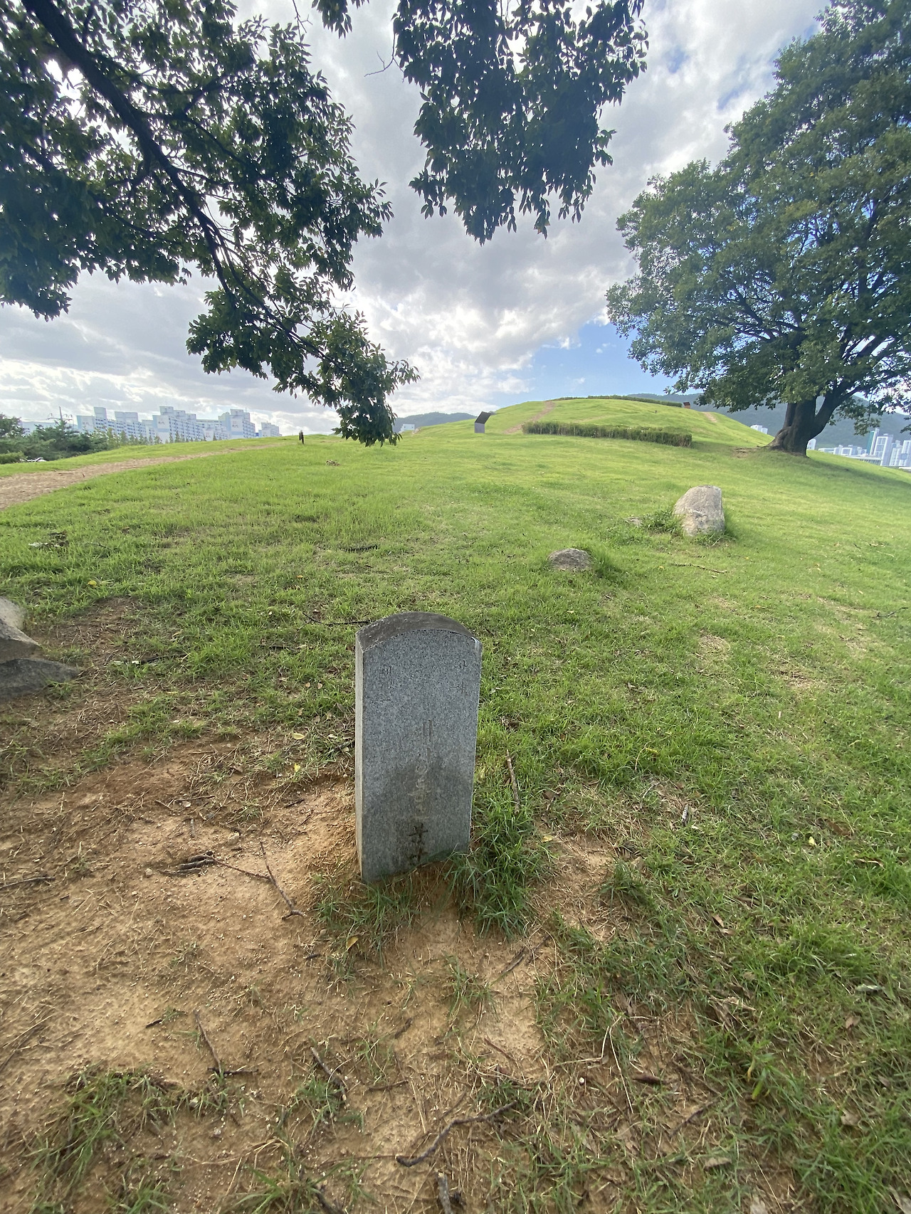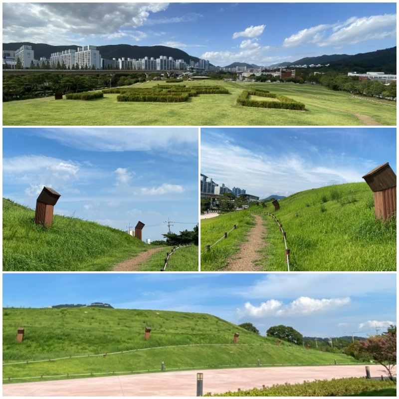 사진에서도 보이듯이 이 오래된 유적지의 주변은 높은 아파트가 즐비한 도시의 모습이다. 볼품없는 콘크리트 건물들이 유적지와는 어울리지 않아 흉물스럽다고 여기는 사람들도 있지만, 잘 보존된다면 이것도 김해의 매력이 될 수 있다고 생각했다. 옛것의 정취를 마치 일상의 한 부분처럼 가까이에서 만날 수 있는 환경이 그리 흔한 것은 아니기 때문이다. 실제로 더운 날씨였는데도 고분군 주변을 둘레길처럼 걷고 있는 사람들이 꽤 눈에 띄었다. 나도 산책하듯 오솔길처럼 놓인 길을 따라 걸었다.