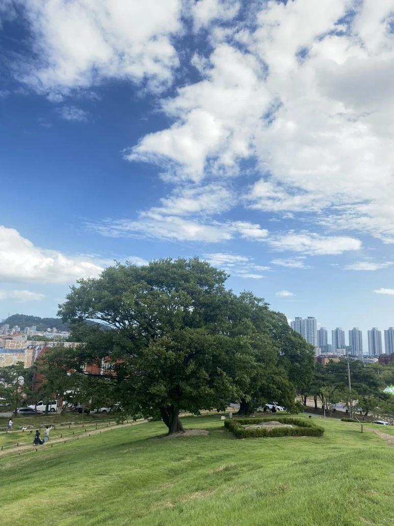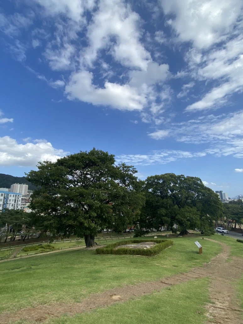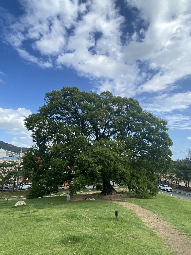 특히 앞쪽에 있는 나무는 평지와 경사면에 걸쳐 있었는데 가지들이 절묘하게 균형을 잡고 있었다. 수형이 우아했다. 나무 아래에는 대성동 고분 제73호분의 자리가 보존되어 있다. 한 눈에도 품고 있는 세월이 느껴졌다. 어딘가에 나무에 대한 설명이 있음 직한 생김인데도 아무것도 없었다. 나중에 숙소로 돌아와 검색을 했는데 나무에 대한 설명은 찾을 수 없었고 뜻밖으로 '왕따 나무'라는 별칭을 발견했다. 왕따라니. 그 숭한 표현이 왜 나무의 이름이 되었는지 궁금했는데 이것 또한 수긍할만한 설명이 없었다. 다만, 이곳이 요즘 유행하는 인생샷을 찍기 좋은 포토존으로 알려졌다고 하고 여러 장의 멋진 사진들을 보니 그 이름에 대해 짐작되는 건 있었다.