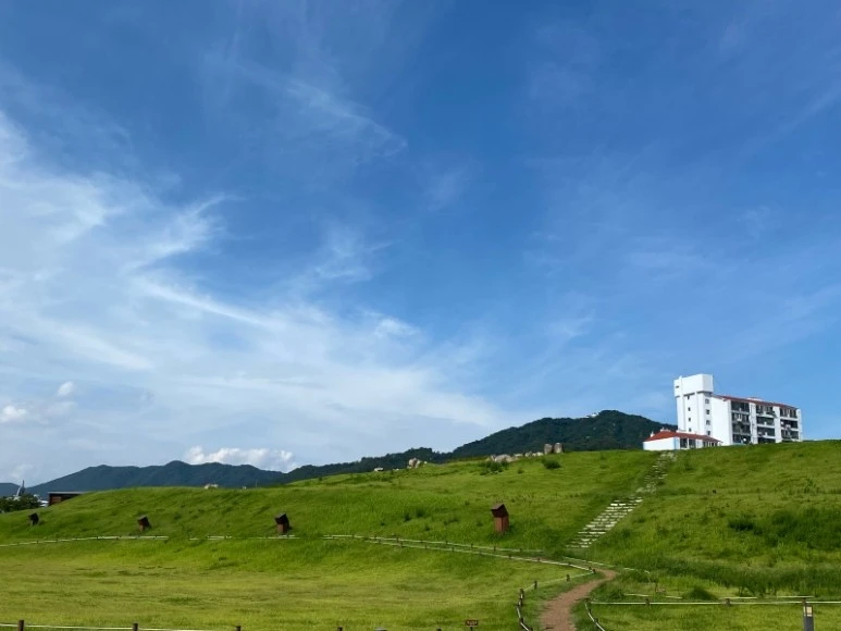 그래, 여기부터 들어가자!라는 생각이 살짝 스치긴 했지만 걸음은 이 건물을 지나치고 있었다. 호기롭게 첫날부터 한 건(?) 하겠다던 계획은 더위와 배고픔이라는 지극히 원초적인 감정에 쉽게 무너졌다. 아니 그보다는 나는 아직 마음의 준비가 안된 것이다. 집에서 혼자 할 수 있는 모든 활동을 좋아한다고 혼자 여행하는 것도 좋아하는 건 아니라는 걸 증명하러 온 사람이 된 기분이었다. 좀 늦은 오후라 시간이 애매하다는 걸 핑계 삼아 근처에 있을 '많은' 갈 곳은 그야말로 아득했고 바로 눈앞에 보이는 박물관도 다음으로 미룬다. 발굴된 유물들은 모두 박물관 안에 있을 테니 터만 남은 고분군에 뭐 볼 게 있을까 싶었지만 푸른 하늘과 맞닿아 있는 부드러운 능선은 오늘 처음 느끼는 고요함이었다.