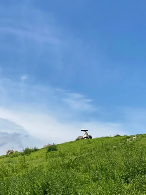 고분군을 향해 올라가기 시작했을 때 유난히 시선을 끄는 두 사람이 있었다. 엄마로 보이는 양산을 쓴 여인과 어린 사내아이였는데 더운 날씨인데도 아이는 투정도 부리지도 않고 오히려 해맑게 웃으며 햇살 속을 뛰어다녔다. 아이의 웃음소리가 내게까지 들렸다. 문득, '클로드 모네'의 양산을 쓴 여인(Woman with a Parasol)이 떠올랐다. 모네가 산책 중인 그의 아내 카미유와 아들 장을 그린 그림이다. 만약 저 초록의 능선에 붉은 '개양귀비꽃'이라도 피었다면 또 다른 모네의 그림도 떠올랐을 것이다. 미풍에 날리는 드레스를 입고 프릴 달린 양산을 쓴 것도 아니고 각도도 다르지만 현재 속에 누워있는 오래된 유적지가 주는 묘한 기류와 구름이 강처럼 흐르는 여름 하늘, 이 모든 것을 즐기는 두 사람은 명화보다 더 다정한 이야기를 품고 있을 것 같았다.