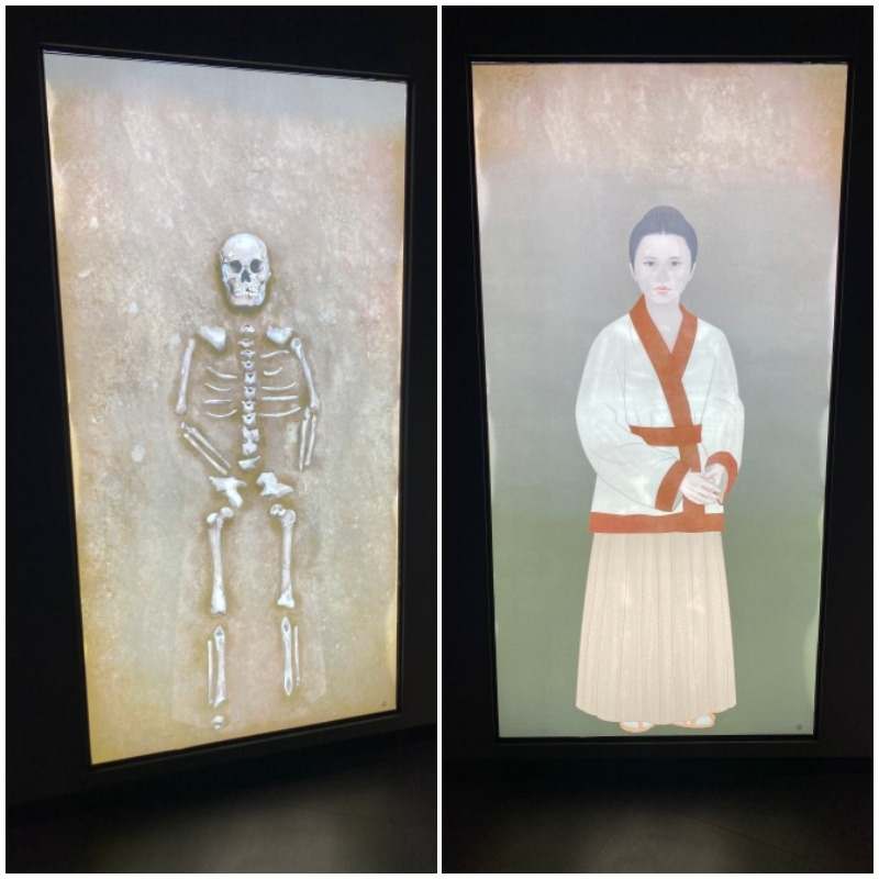 전시장에는 재미있는 전시물이 하나 있었다. 대성동 57호 분에서 조사된 금관가야 여성의 복원 그림이 관람자가 보는 위치에 따라 인골 또는 여인의 모습으로 보이도록 한 렌티큘러(Lenticular) 기법의 설치물이다. 정면에 섰다가 살짝 왼쪽으로 움직이면 인골이 보이고 다시 오른쪽으로 움직이면 여인의 모습이 나타난다. 박물관 입구에서 여러 명의 어린 학생들이 영상 모니터 앞에 모여있는 걸 보았는데 다소 정적인 전시물을 보다가 이런 설치물을 만나면 박물관에 대한 이미지가 조금 달라지지 않을까 싶었다.