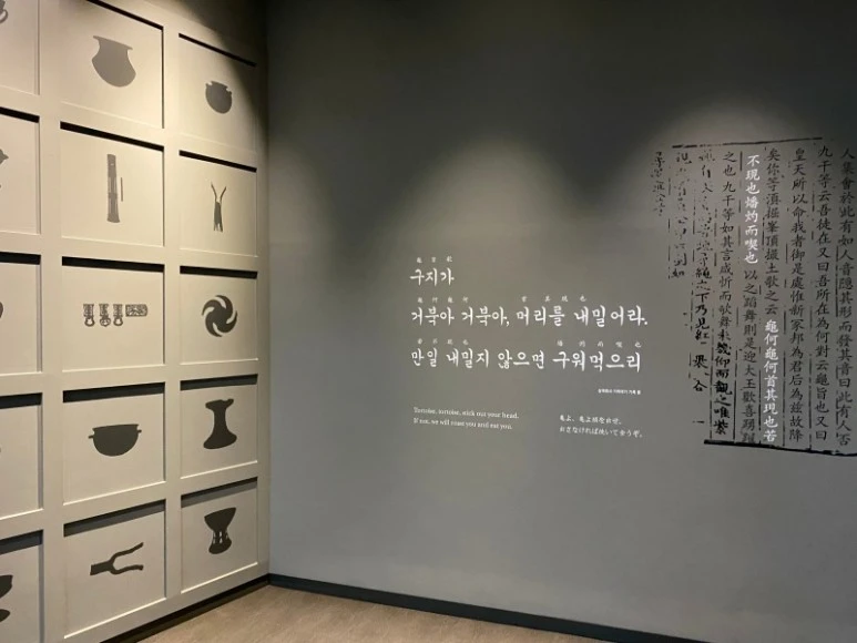 입구에서 왼쪽으로 들어가면 바로 만나는 벽에는 '구간들이 왕을 맞이하다, 구지가.'라는 제목의 설명과 함께 구지가가 적혀있다. 구지가는 가락국 시조 수로왕의 '강림 신화' 속에 삽입된 내용이다. 구지가의 핵심은 '머리를 내놓으라'는 것인데, 현제의 우리들에겐 사형 혹은 죽음을 연상시키는 머리를 내놓는다는 것이 당시에는 곧 새로운 탄생을 뜻하여, 하늘에서 내려진 알에서 수로왕이 탄생하는 것을 나타낸다고 한다.