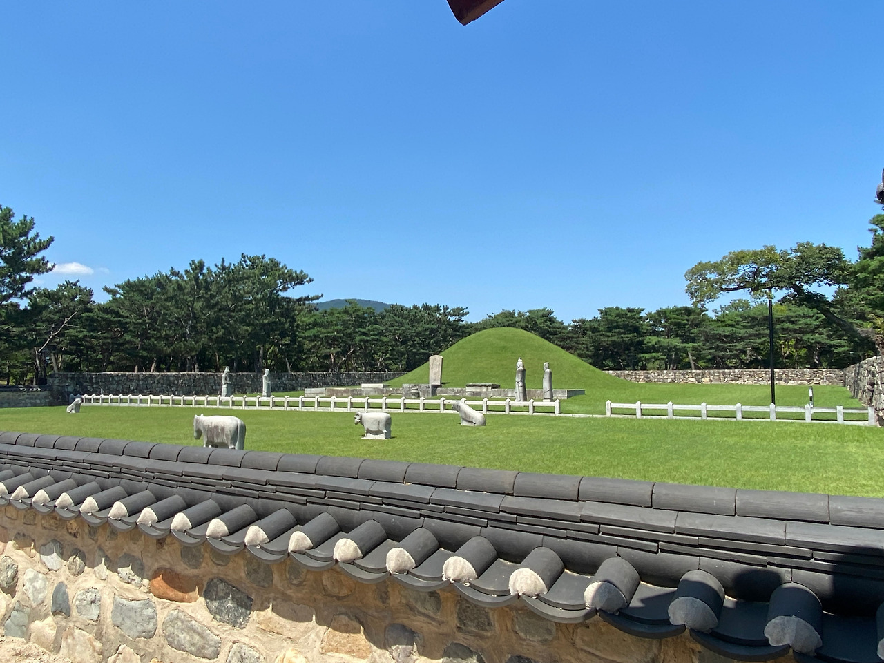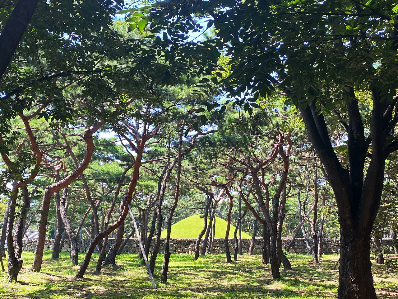 담장 밖에서 바라보는 수로왕릉, 안으로 들어설 수는 없지만 대신 담장이 낮아서 이렇게나마 사진을 찍을 수 있다. 둥근 형태가 주는 안온함의 최상급에 속할 풍경이란 생각이 들었다. 가까이 가서 보면 웅장하겠지만 오히려 거리감이 있어서 크기에 압도당하지 않고, 능 전체에 기품이 흘러 좋았다.