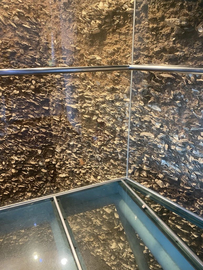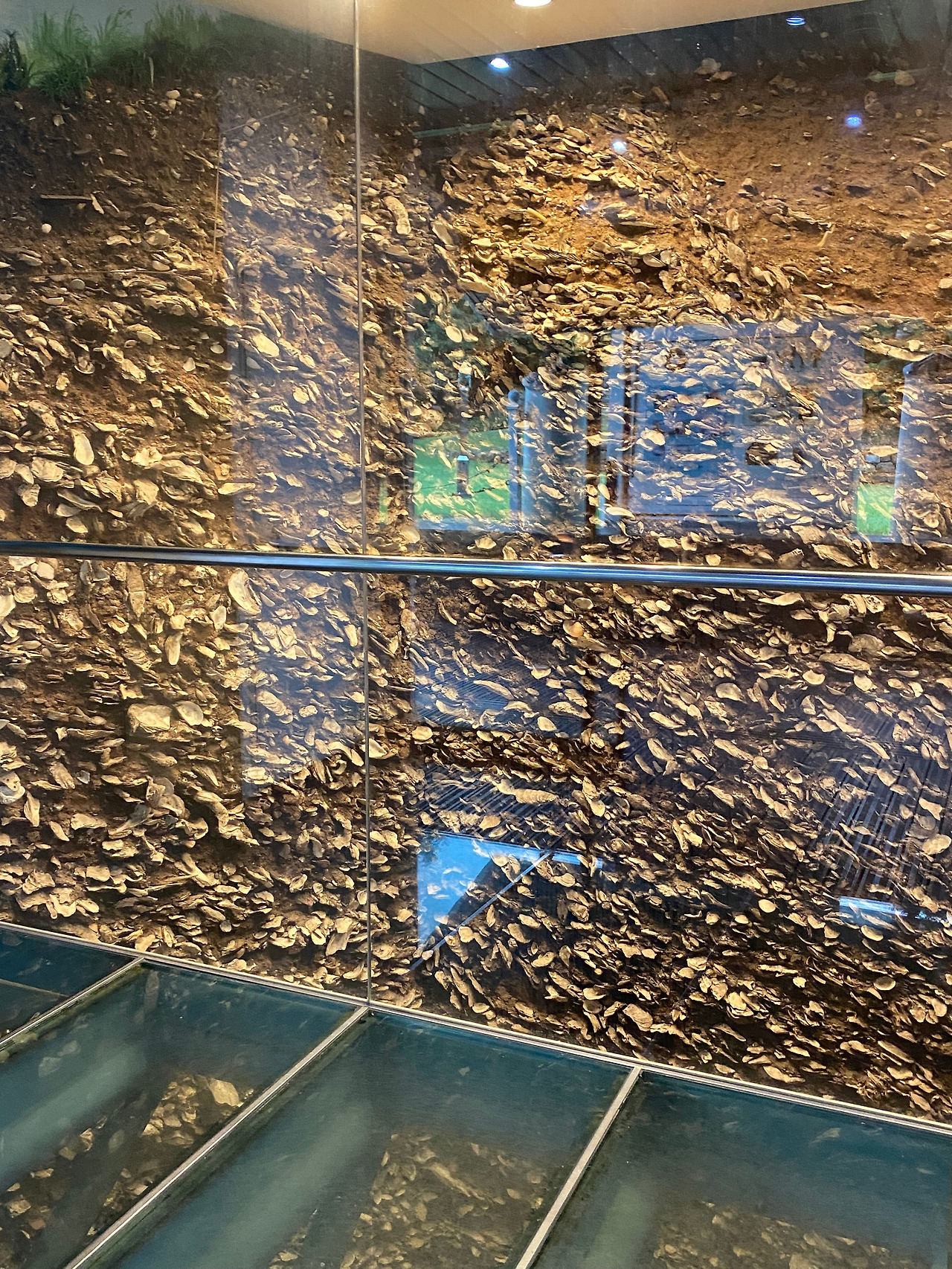 조금 습하고 따뜻한(?) 공기가 가득 찬 그리 크지 않은 전시방은 규모에 비해 놀라움은 수십 배쯤 될 듯합니다. 사실 가장 놀랐던 이유는 지금 막 내가 디딘 바닥이 유리라서 무엇인가 까마득한 것이 아래에 있고 찰나이긴 했지만 그걸 제가 무방비 상태로 보았다는 것입니다. 마치 고층 아파트의 발코니 같았는데 시선을 분산시킬 곳이 없이 꽉 차고 막힌 방이라서 더 놀랐던 것 같아요.