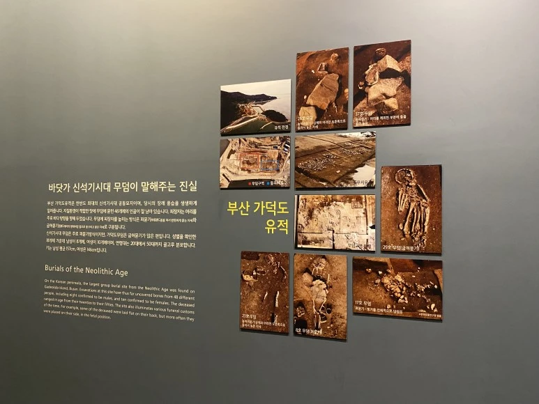 이곳은 부산 가덕도에서 발굴한 유물들을 모아놓은 방이다. 가덕도 유적은 한반도 최대의 신석기시대 공동묘지이며 당시의 장례풍습을 자세히 알 수 있는 자료다. 지질환경이 보존에 적합한 덕분에 무덤에 묻혀있던 48 개체의 인골이 잘 보존되어서 피장자의 머리가 주로 바다 쪽을 향한다는 것도 알 수 있다. 설명을 읽으며 바다를 좋아하는 여자는 이유도 모른 채 또 뭉클하다.