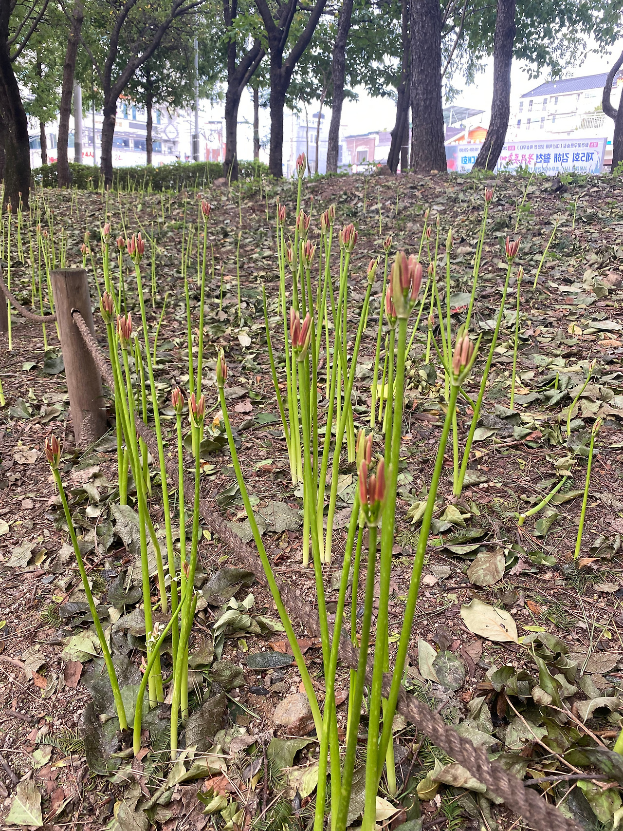 잎이 없이 꽃이 먼저 피어서 상사화와 함께 금세 알아볼 수 있는 꽃이다. 놀랍게도 길 양옆이 꽃무릇 군락지였다. 가늘지만 꼿꼿한 연두 줄기들이 입을 야무지게 꼭 다물고 선연할 붉은빛을 익히고 있었다. 숙소까지 걷는 내내 아직은 숨은듯한 존재감의 꽃무릇은 계속되었고 안내 플래카드를 보고서 9월 18일에 꽃무릇 축제가 열린다는 것도 알았다. 숙소에 돌아와서 찾아보니 축제 때는 경로잔치와 사생대회도 열리고, 이 산책로는 25년 만에야 제대로 된 이름을 얻은. 활천 꽃무릇 숲길이 었다. 하지만 동단위 지역축제라서 그런지 김해시에서 준 여러 개의 여행 가이드 어디에도 언급되지 않은 곳이다. 숲길에 반해서 나라도 알려야겠다는 시시한 사명감으로 꽃들이 만개할 때까지 날마다 숲길을 지켜보기로 한다.