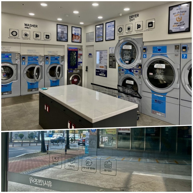 지금 생각하면 사비를 조금 보탰어도 괜찮았을 텐데 시에서 제공하는 숙박비에 맞추는 걸 마치 여행의 목표 중 하나인 것처럼 즐기는 마음이 있어서 먼저 여행한 분의 리뷰를 보고 망설임 없이 선택했었다. 그리 후회하지 않는 결정이었지만 세탁실은 아쉬웠다. 그래도 객실 안에 놀랍게도(?) 스타일러가 있어서 아주 유용하게 잘 썼다. 하지만 물빨래를 해야 하는 것들이 있으니 근처에 빨래방이 있는지 찾아보았다. 다행히 숙소에서 10분 정도만 걸으면 '워쉬 앤 조이''라는 빨래방이 있었다. 무인으로 운영되는 셀프 빨래방이었다.