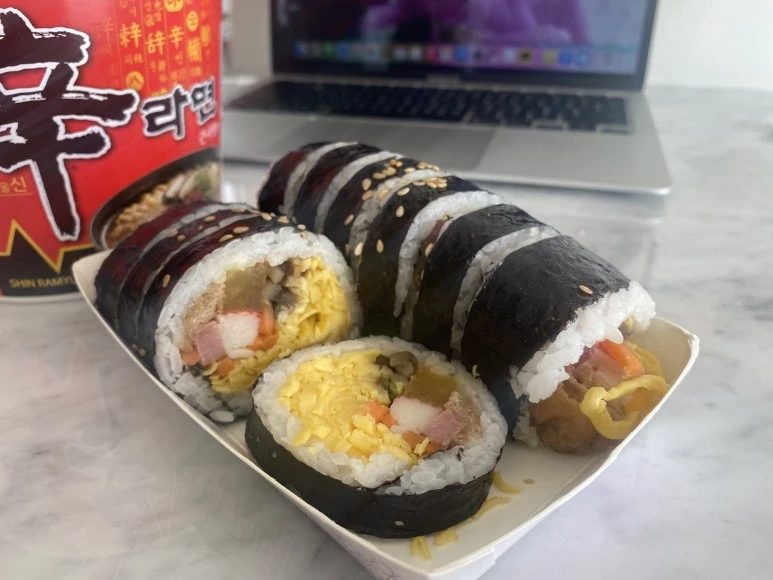 우연히 발견한 꽃무릇 산책로가 생각보다도 훨씬 길어서 처음으로 끝까지 가본 날, 평소엔 다니지 않던 길을 건너 숙소로 오는 중에 발견한 김밥집이다. 평소엔 컵라면을 거의 먹지 않지만 '김밥과 컵라면'세트는 일 년에 한두 번은 먹게 되는 조합이다. 김밥을 좋아해서 평소에 자주 만들어 먹기도 하고 내가 만든 게 가장 맛있다는 반 협박성 인정을 식구들에게 받아내며 자부심을 느낀 적도 있지만, 이젠 될 수 있으면 부엌과는 좀 소원한 관계로 남고 싶은 나이가 되다 보니 남이 해 준 음식이 가장 맛있다. 그래서 맛이 다소 부족해도 사 먹는 김밥이 더 맛있다. 김밥은 가성비를 무시할 수 없는 음식이다. 재료가 호화롭고 비싼 변형(?)김밥은 아무리 맛있어도 제 값을 못한다. 모름지기 김밥은 간편하면서도 맛있고, 맛있으면서 가격이 싸야 비로소 완성되는 음식이다.