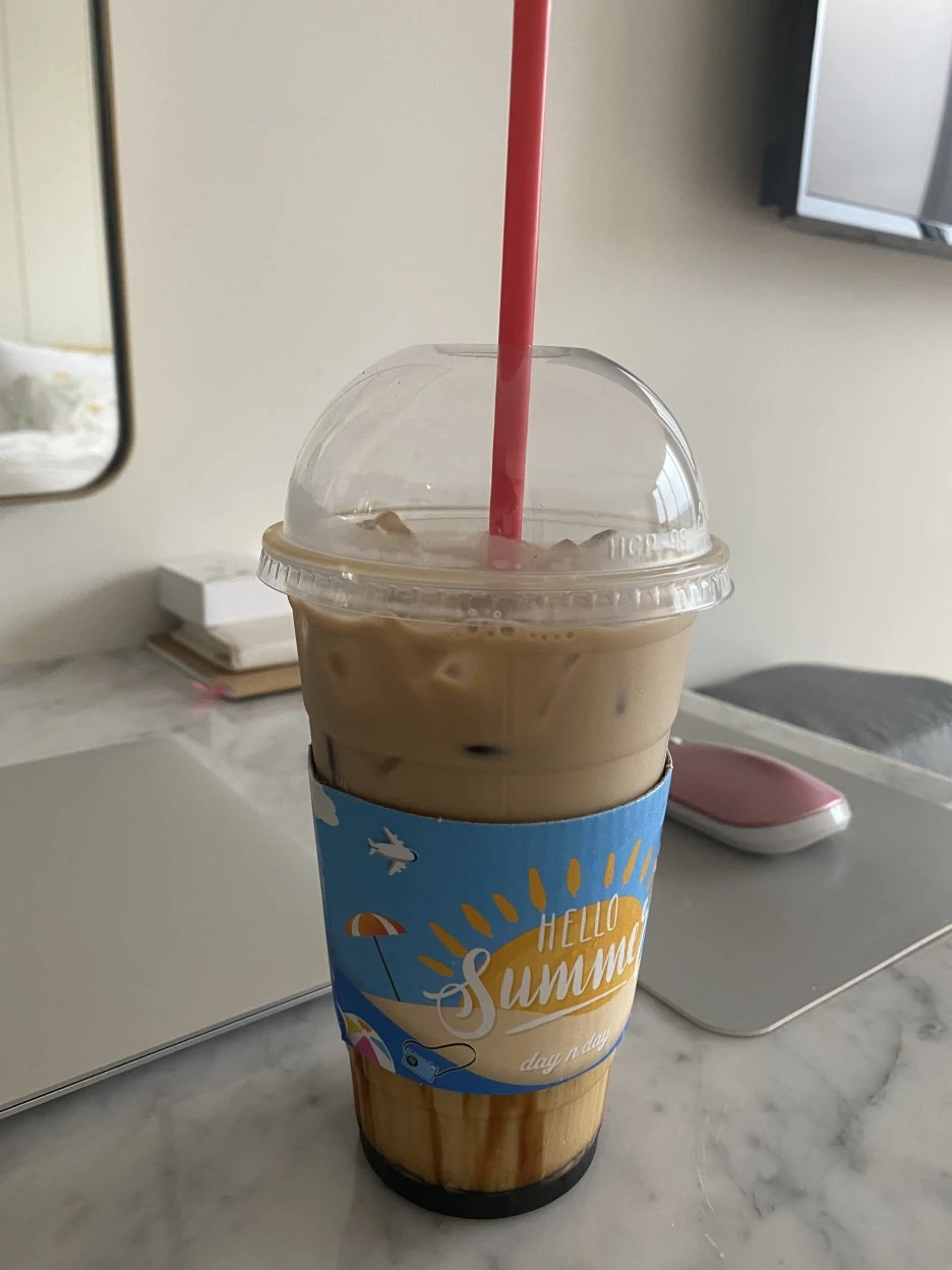 일층 로비 옆에는 숙소에서 운영하는 카페가 있다. 신청하면 7.000원에 먹을 수 있는 조식 공간과 간이 편의점이 함께 있다. 평소에 커피는 주로 카누로 해결하고 가끔 카페에서 마실 때도 늘 아메리카노, 가끔 카푸치노인데 숙소에 도착한 첫날, 조금 출출해서 안 마시던 라떼를 시켰었다. 흑설탕 맛을 좋아하는데 '흑당 라떼'가 있었다. 그리고는 그 맛에 반해서 세 번째로 사러간 날이었다. 원래 열 잔 사면 한 잔 공짜지만 오래 계시니까 오늘은 써~비쓰로 드릴게요.