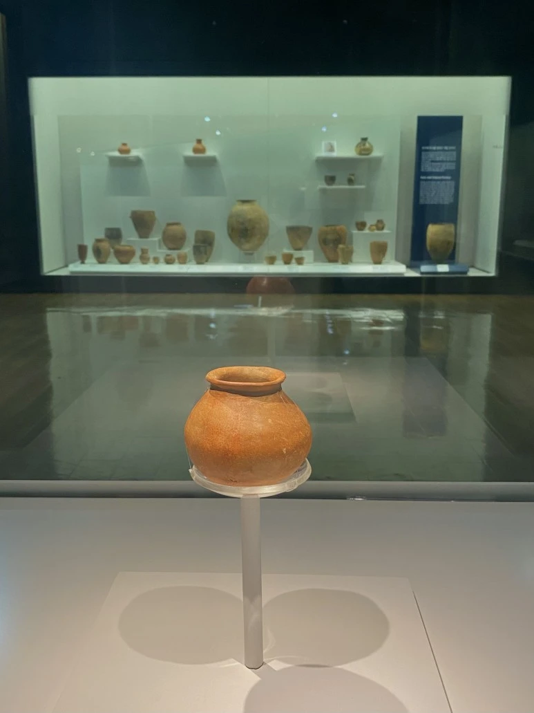 진주 대평리에서 발굴된 붉은 간토기다. 토기를 무척 좋아하면서도 자연발생적인 은은한 붉은빛이 아니라 안료를 사용한 붉은색이라 첫눈에 반한 토기는 아닌데, 홀로 떨어져 있는 전시효과 덕분인지 독보적인 카리스마가 있어서 쉽게 자리를 뜰 수 없었다. 다른 토기들에 비해 쉽게 성품이 드러나지 않아서 그야말로 밀당하듯 주변을 어슬렁거렸다.