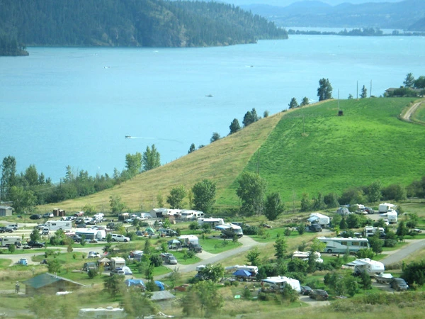 우리가 달리고 있는 길에서는 아래로 내려갈 수가 없어서 아쉽게 바라보기만 하면서 그냥 지나쳤습니다. 얼핏 보기에 캠핑 사이트 같았어요. 호숫가엔 작은 요트들도 정박해 있고... 즐기는 사람들은 더 좋겠지만 이렇게 원경으로 바라보는 것도 좋았습니다. 높이 멀리 있어서 전체 풍경을 한눈에 볼 수 있으니까요. 달리는 차 안이라 잠깐 보고 사진도 서둘러 찍어야 해서 좀 아쉽긴 했습니다.