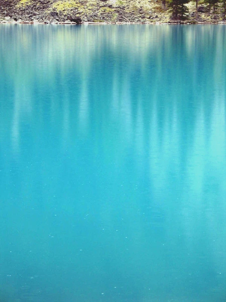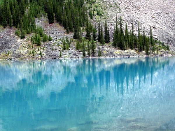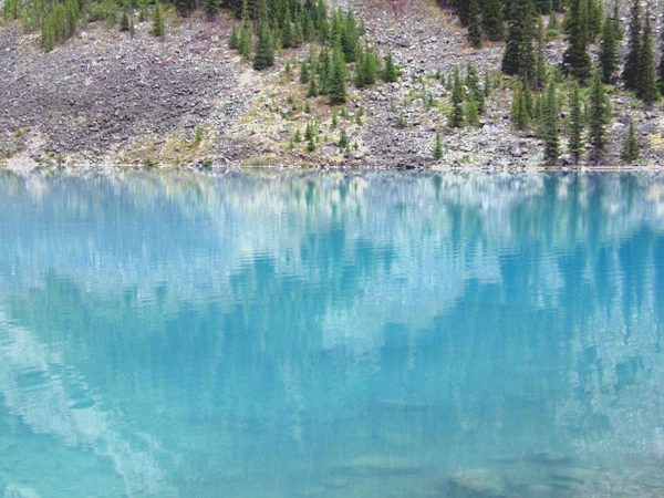 빙하가 녹아 흘러내릴 때 호수 주변을 감싸고 있는 열개의 봉우리를 거치면서 부유물들은 모두 침전되고 맑은 물만 호수에 도착하기 때문에 다른 호수들보다 침전물이 없어서 물빛이 맑다고 합니다. 근처에 있는 루이스 호수와 비교해 보면 그 차이를 금세 느낄 수 있습니다. 루이스 호수의 물빛은 약간 우윳빛이 돌거든요.