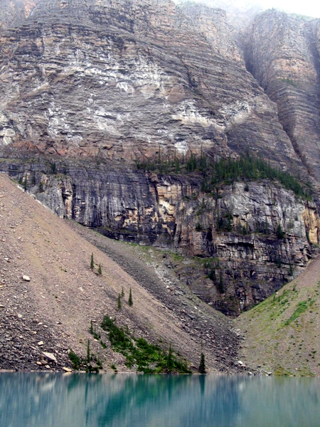 이 열개의 산봉우리에서 떨어져 내린 바위들이 쌓여서 자연 제방을 이루면서 생긴 호수가 '모레인'입니다. 자연 제방은 사진에서 보이는 것보다도 훨씬 크고 높습니다. 빌딩을 짓듯 맘먹고 일부러 쌓았다고 해도 믿기 어려운 규모와 형태라서 시간의 축적이 만든 자연의 경이로움에 또 감탄합니다.