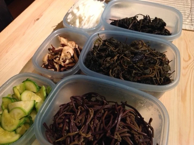 잘 씻어서 물기를 꼭 짜서 따로따로 담아놓고 소금에 살짝 절인 호박도 짜고 무채도 썰고 표고버섯도 물에 불려 꼭 짠 후, 얇게 썰어서 볶는다. 가지는 말린 게 없으면 썰어서 끓는 물에 살짝 데친 후에 물기 짜서 볶으면 그런대로 말린 것과 비슷한 맛이 났다. 십여 년 전에 안동의 '헛제삿밥'이란 걸 먹어본 후로는 간장을 사용한 비빔밥의 깔끔한 맛에 반했지만 그래도 비빔밥의 원형은 고추장, 나는 간 소고기를 조금 넣고 볶은 약고추장을 주로 쓴다.