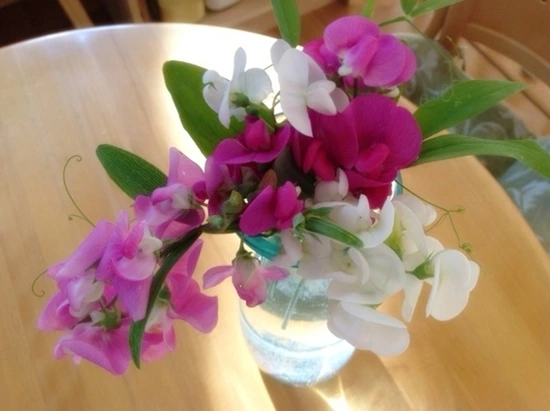 너른 마당은 잔디밭이 다 차지해서 측백나무 담장 아래에 조금 남은 빈 땅에 씨앗을 훌훌 뿌리고는 예년보다 자주 오는 비에게 모든 걸 맡겨놓고 별로 돌보지도 않았는데 스위트피는 놀랄 만큼 빠르게 자라며 제 영토를 넓혀가더니 여름 햇살이 쏟아지 듯 와르르와르르 꽃이 피었습니다. 색깔대로 조금 꺾어다 유리병에 꽂아두었더니 오가며 볼때마다 저절로 미소 짓게 되더군요.
