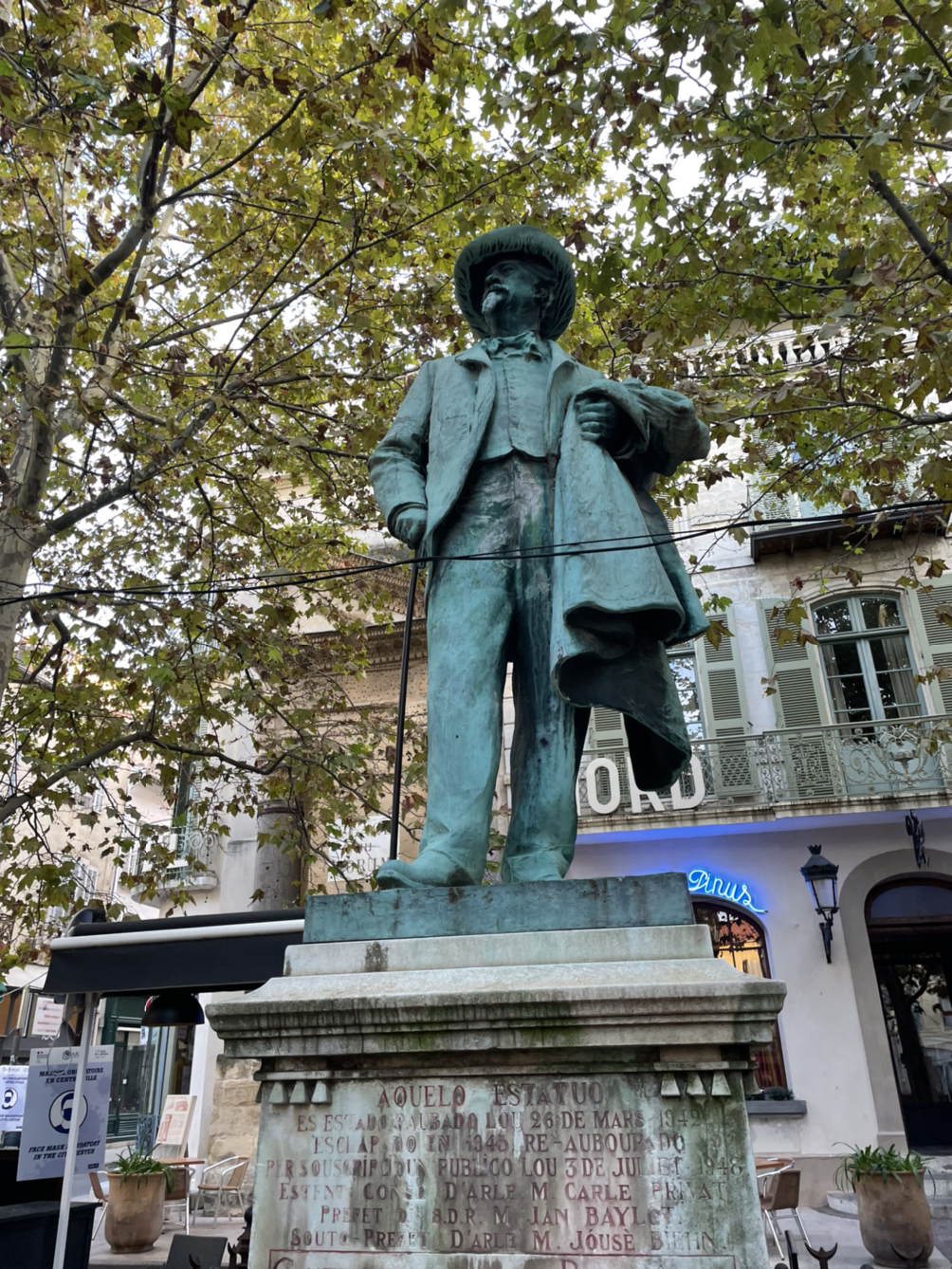 동상의 시선의 끝을 따라가면 <밤의 테라스>의 배경이 된 반 고흐 카페가 있다.