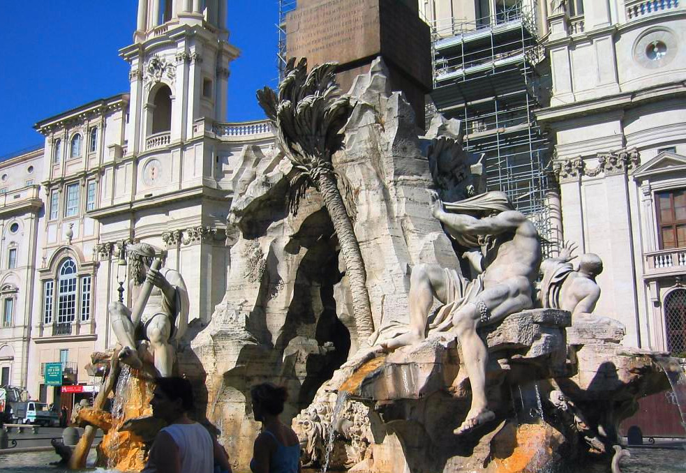바로크 시대의 로마는 또 어떠한가. 특별히 로마의 수많은 역동적인 분수들 가운데, 나보나 광장의 분수들 중앙에 놓인 그 섬세하면서도 웅장한 조각들은 또 무엇인가. 툭 걸쳐진 옷가지가 당장에라도 흘러내릴 것 같고, 인물의 근육이 살아있는 사람들의 그것보다 더 생동감 넘친다. 특히 중앙에 놓인 4대 강의 분수를 지키고 있는 베르니니의 조각상은 온몸으로 표현하는 특유의 연기력으로 웃음마저 짓게 한다. 산타 아녜제 인 아고네 성당이 배경이 되어 완벽한 그림이 완성되도록 한 베르니니의 연출력 또한 감탄할 수밖에 없는 최고의 걸작이다.