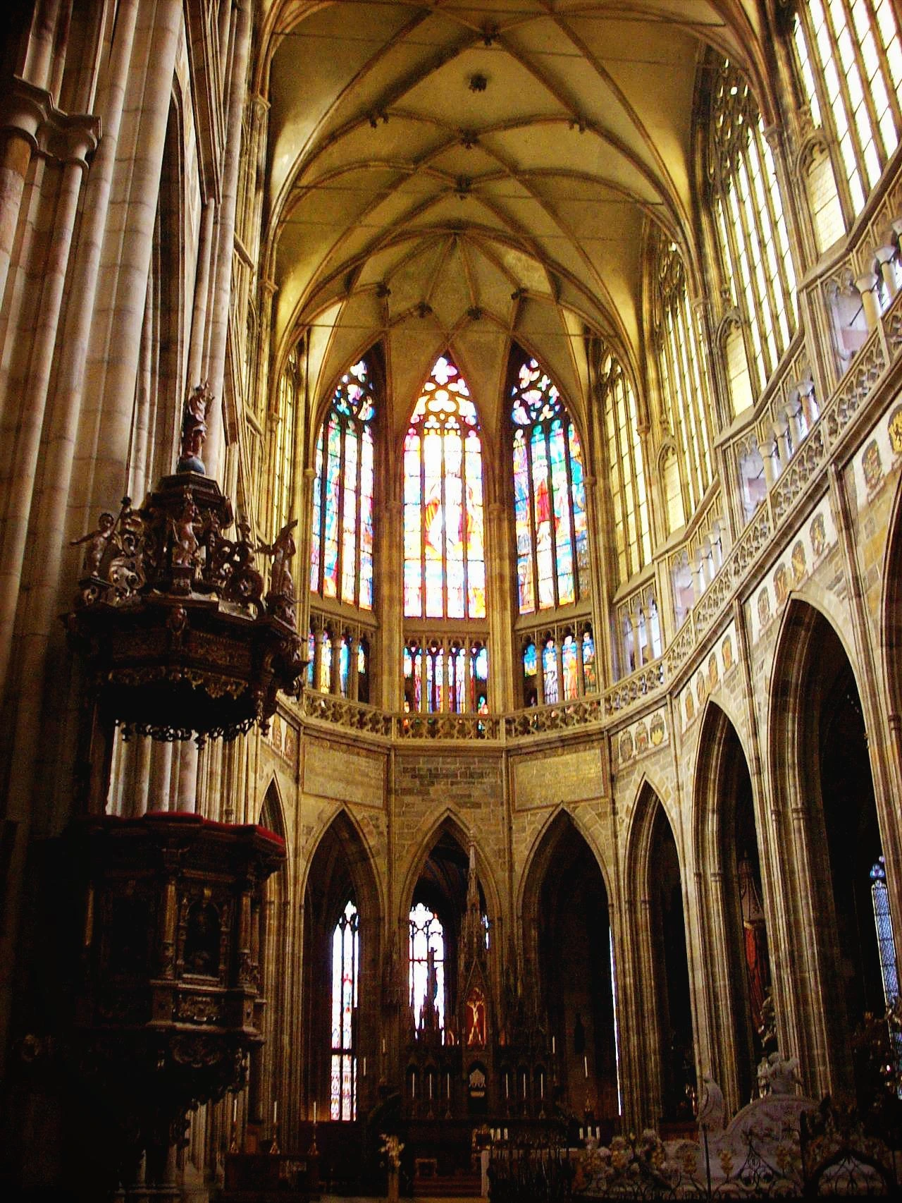드디어 본격적으로 성 비투스 대성당에 발을 들여놓자 와! 하는 탄성이 절로 나온다. 하늘로 닿고자 하는 인간의 마음이 이보다 더 높을 수 있을까? 고딕의 천장은 아무리 목을 뒤로 꺾어도 눈길이 쉬이 닫지 않을 높이에 있고, 어둑한 실내의 공기를 구석구석 잠재우는 스테인드글라스는 사방에서 하나하나 황홀한 디자인과 화려한 조합의 영롱한 빛을 뿜으며 자기만의 이야기를 전달하고 있다. 사진으로 이 느낌을 온전히 담기는 불가능하단 걸 알면서도 셔터를 누르다 보니 순식간에 시간이 흐른다. 온전히 압도당한 상태에서 성당 전망대로 올라가니, 붉은 지붕들 너머로 보이는 구불거리는 블타바강의 시원한 정경이 이 도시의 존재감을 다시금 일깨운다.