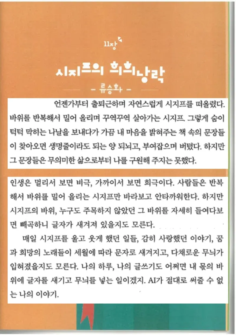 정원: 인생은 멀리서 보면 비극, 가까이서 보면 희극이다. 사람들은 반복해서 바위를 밀어 올리는 시지프만 바라보고 안타까워한다. 하지만 시지프의 바위, 누구도 주목하지 않았던 그 바위를 자세히 들여다보면 빼곡하니 글자가 새겨져 있을지도 모른다. (바위의 색이 변화함.)매일 시지프를 울고 웃게 했던 일들, 감히 사랑했던 이야기, 꿈과 희망의 노래들이 세월에 따라 문자로 새겨지고, 다채로운 무늬가 입혀졌을지도 모른다. 나의 하루, 나의 글쓰기도 어쩌면 내 몫의 바위에 글자를 새기고 무늬를 넣는 일이겠지. AI가 절대로 써줄 수 없는 나의 이야기.