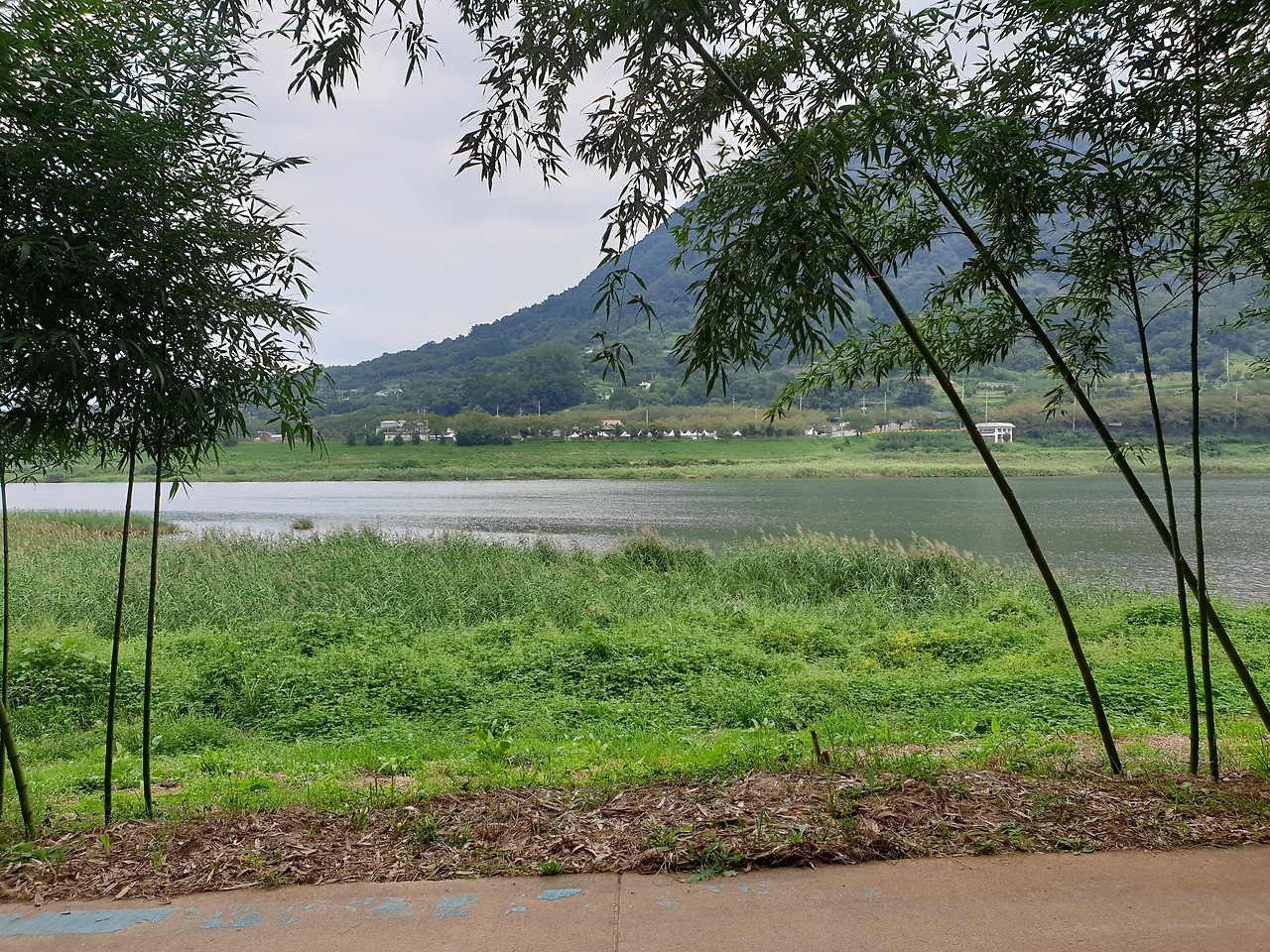 강과 마주한 대숲길의 한가로움