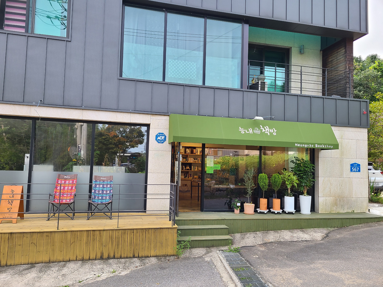 아쉽고 안타까운 마음을 뒤로한 채 역사 뒤편으로 발걸음을 옮긴다. 특별한 공간을 찾겠다는 기대보다는 따뜻한 커피 한잔을 마실 수 있는 곳을 찾던 중이었다. 그때 허름한 건물 유리창에 붙은 손글씨의 안내문 하나가 보인다. ‘능내책방, 길 건너 모퉁이’. 그리고는 화살표 하나가 그려져 있다. 설마 이런 곳에 책방이 있겠어, 라고 생각하며 발걸음을 옮긴다. 길을 건너니 올리브를 닮은 녹색의 간판이 보인다. ‘능내책방’. 설마가 현실이 되는 순간의 감동을 어떻게 설명해야 할까.