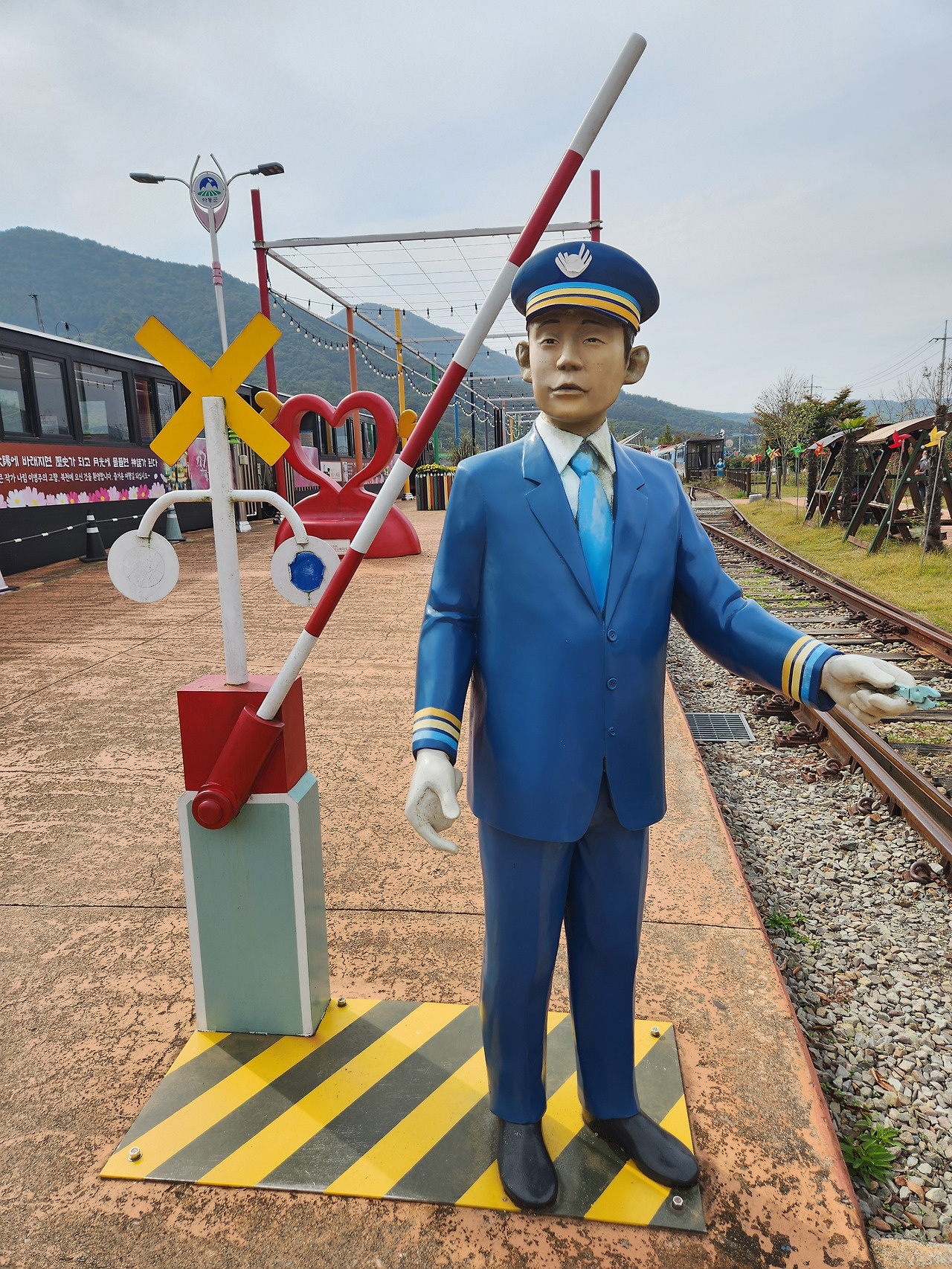 승장장 쪽으로 나가다 보니 건널목이 보인다. 철도 제복을 갖춰 입은 역장이 한 손에 검표 가위를 들고 지키고 있다. 실제와 비슷한 크기로 제작된 모형이다. 하트와 부엉이로 장식한 포토존은 물론 색연필 모양으로 둘러싸인 의자까지 그야말로 사진찍기 좋은 곳이다. 최고의 포토존은 역시 풍경 열차다. 증기기관차처럼 생겼는데 레일바이크 표를 구매하면 풍경 열차를 타고 인근의 양보역까지 가서 레일바이크를 타고 돌아온다고 한다. 아쉽게도 내가 방문한 시간에는 운행 일정이 없어 타볼 수가 없었다.
