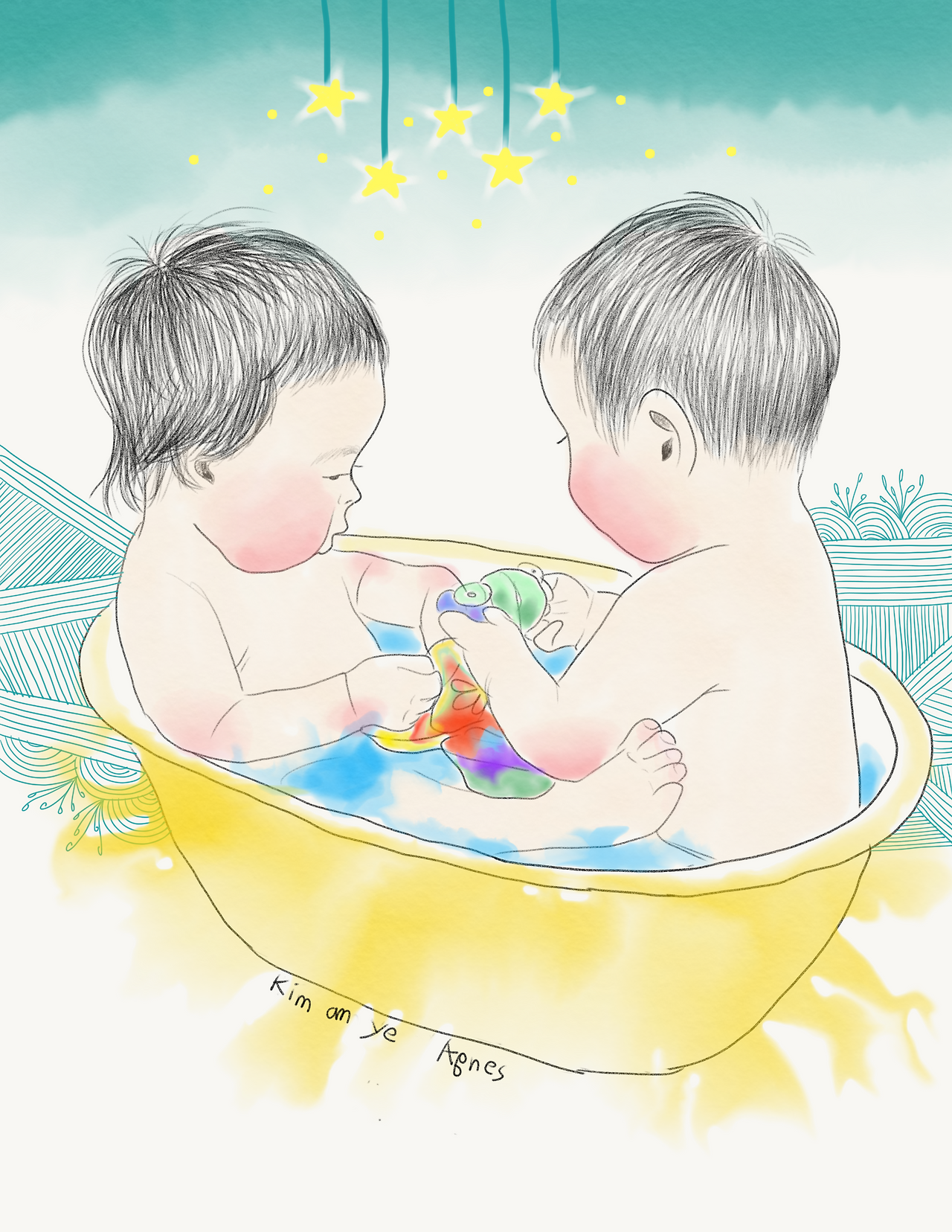 아기 욕조에 둘을 처음 앉혀봤는데 딱이다.