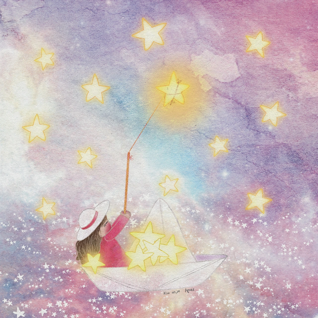 모자를 쓴 아이는 반짝이는 별을 하나씩 잡았다.