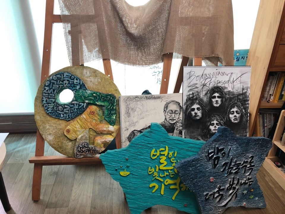 사는 곳이며 작업 공간인 달팽이의 집. 현관을 열고 들어서자 훔쳐가고 싶은 서각, 버닝 작품과 그림들이 벽이며 바닥이며 탁자 위 보이는 곳곳마다 수북하다. 책상 위엔 먹글씨가 가득한 화선지들이 분량을 가늠할 수 없이 켜켜이 쌓여있다. 감탄으로 눈길이 닿는 곳을 따라 달팽이는 큰 눈을 반짝이며 달뜬 목소리로 작품에 담긴 이야기를 쏟아냈다. 스스로가 지나치지 못해 내 손을 이끌어 머문 작품도 있다. 차마 버리지 못하고 창문 유리에 붙여놓은 해바라기 꽃 그림이며, 화선지 더미 속에 파묻혀 있던 서각 작품, 방문에 붙여두고 읽고 또 읽는다는 중용 23장의 글귀. 들어보라며 가만가만 읽어내리는 그의 목소리가 가늘게 떨렸다.