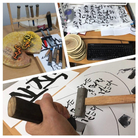 마치 일체감과 같은거야. 혹은 오르가즘 같은거야 말을 하자면. 붓이 물기를 머금으면 정말 아름답거든. ‘붓 끝을 송연하게 하라.’는 신영복 선생님의 말씀이 있어. 붓끝을 정갈하게 뾰족하게 만드는 거야. 그때의 나의 자세를 통해 글을 쓰고 표현하는 거거든. 아름답게 뾰족해 있는, 잘 정리된 붓을 들어서 그 끝으로 화선지에 글을 쓰는 어느 순간, 정말로 쾌감이 확 올라와. 몰입이 끝나는 순간 알지. 내가 후욱 들어갔었다는 걸. 서각할 때도 그래. 이게 내 서각도구야. 무시무시하지? 이걸 이렇게 들어. 얘를 탁 박아서 글씨대로 투두둑, 결대로 투두둑해서 파내는 거야. 그 순간이야. 버닝할 때, 편집할 때도 그랬어. 열정을 쏟을 수 있는 일을 만났다는 점에서 나는 정말 운이 좋은 사람이야.
