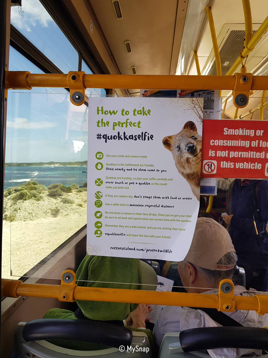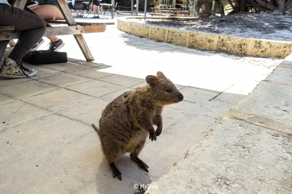 마지막 포인트의 레스토랑에 도착하면 많은 쿼카들이 레스토랑에서 사람들 발 밑으로 다니거나, 나무 밑에서 계속 먹이 찾는 활동을 하고 있다. 그래서 다들 쿼카 사진 찍느라 매우 바쁘다. 쿼카와 사진을 찍는다고 하면, 간혹 억지로 찍는 것이 아닐까 걱정을 한다. 인스타그램 등에서 보면 쿼카와 셀카를 찍은 사진이 수없이 나오는데, 투어 버스에서 친절하게도 쿼카와 셀카를 찍는 방법을 알려주고 있었다.