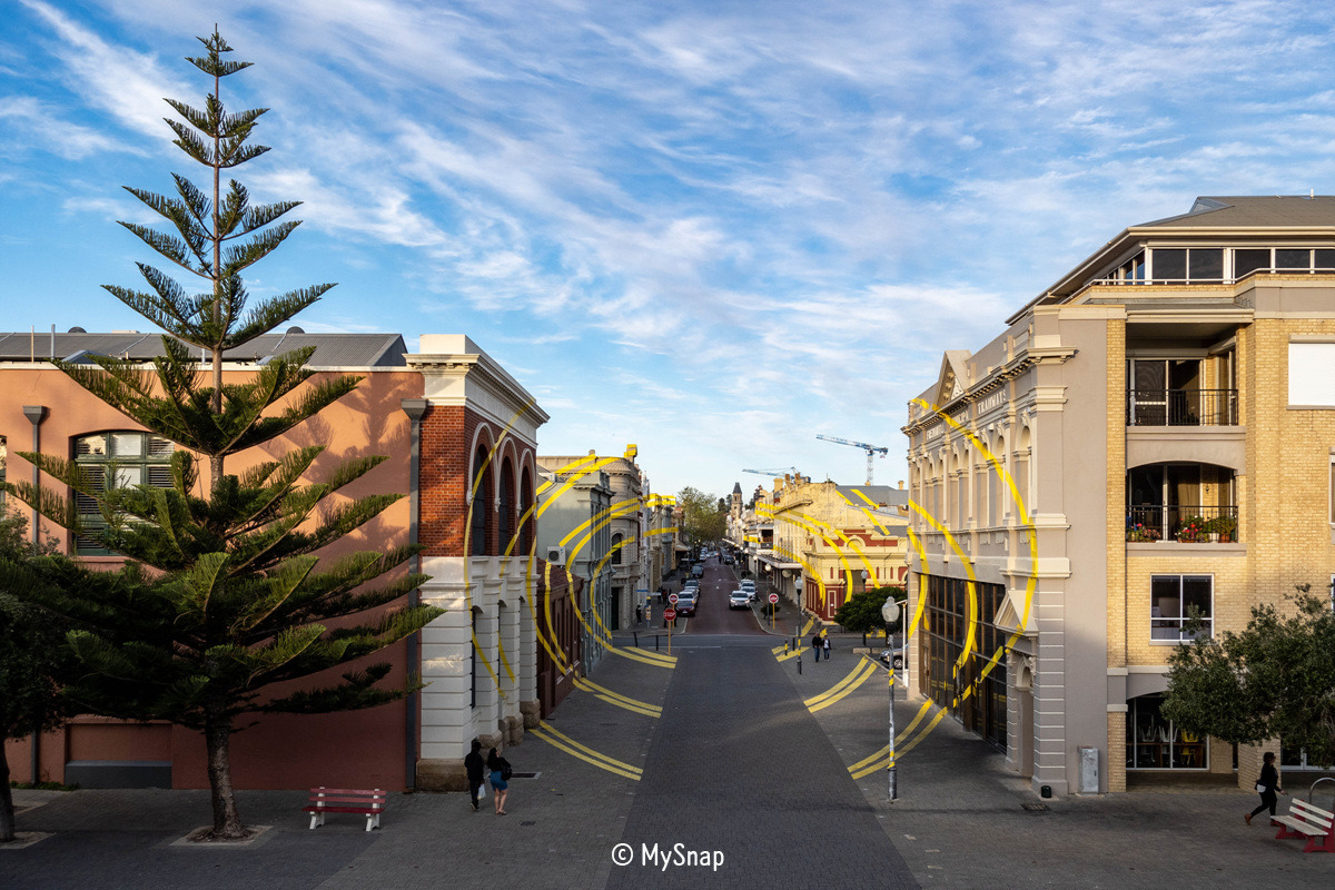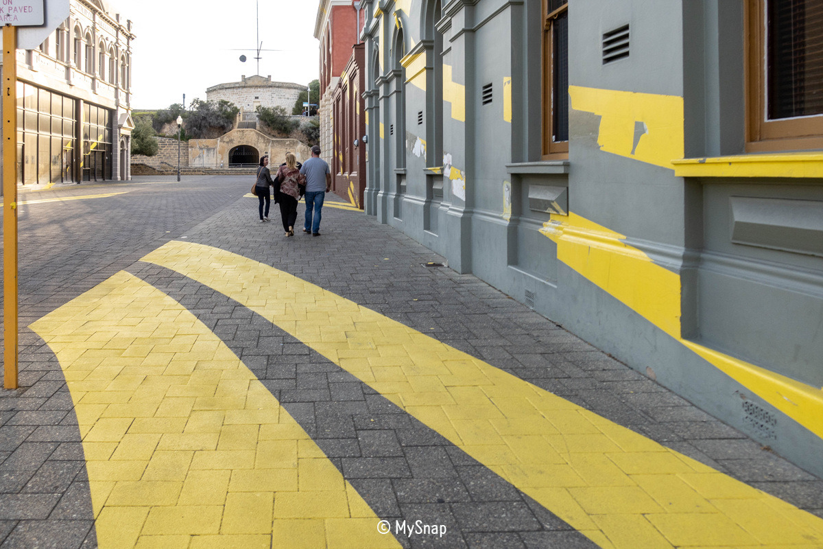 로트네스트 섬 투어를 마치고 프리멘틀 시내를 구경하기로 했다. 길을 걷는데 건물과 도로에 알 수 없는 노란 페인트 자국이 있길래 무엇이지 하고 봤는데, 알고 보니 특정 포인트에서 보면 어떤 문양을 나타내는 것이었다. 마침 그 포인트를 지나고 있었기에 잠시 시간을 내서 봤는데, 신기하기는 했지만 무슨 의미를 나타내는지는 아직까지 잘 모르겠다.
