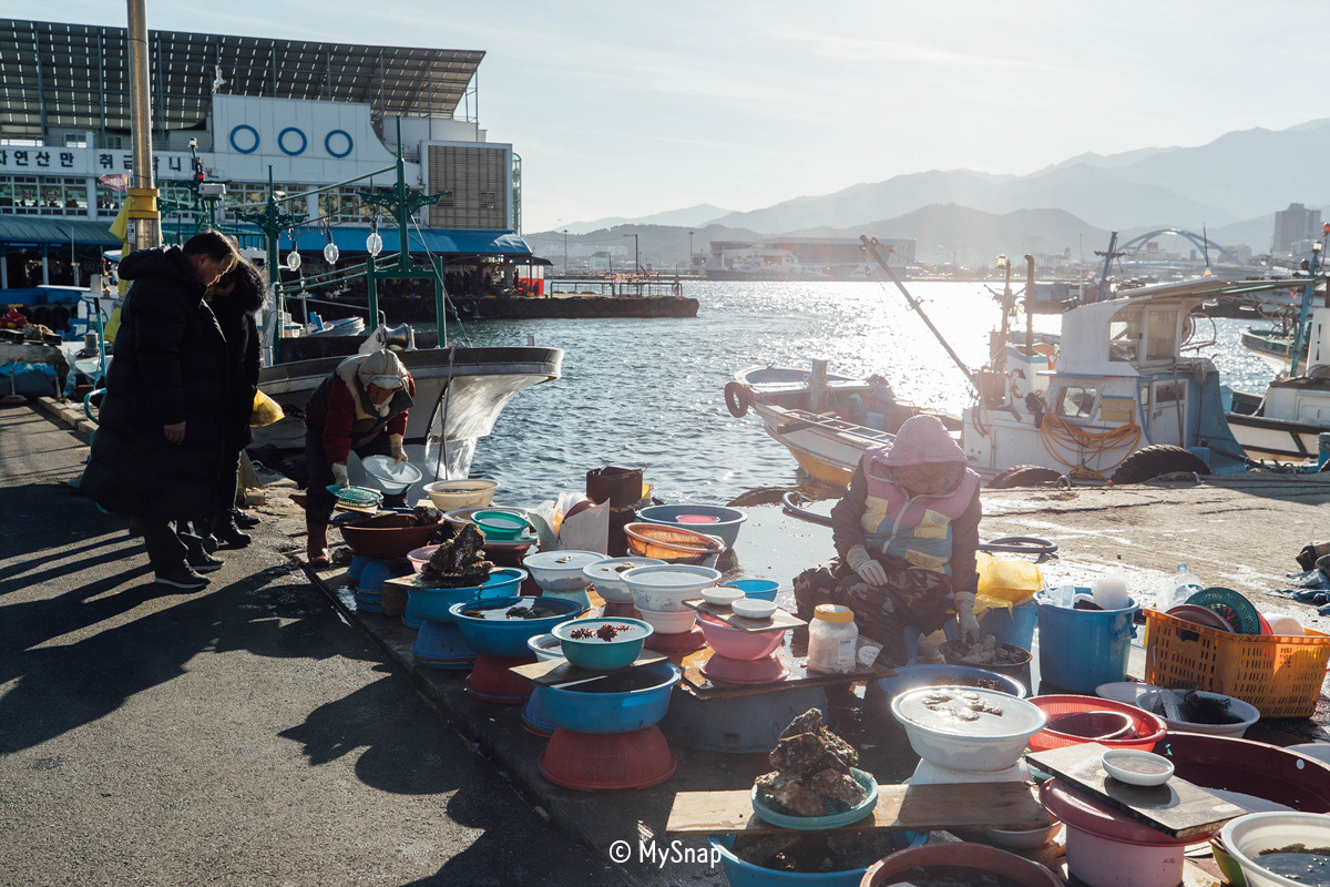 12월 들어서 가장 추운 날이었지만, 아랑곳하지 않고 추위 속에서 해산물을 파는 할머니들의 모습에 계속 눈이 간다. 옆에 숯으로 피운 난로 같은 것이 매캐한 연기를 뿜고 있었지만 날씨 때문인지 실제로 관심을 가지는 관광객들은 극소수에 불과했다. 그래도 이런 것들에 익숙해진 할머니들은 지루함을 달래고자 계속해서 해산물을 하나라도 더 손질하고 계신다.