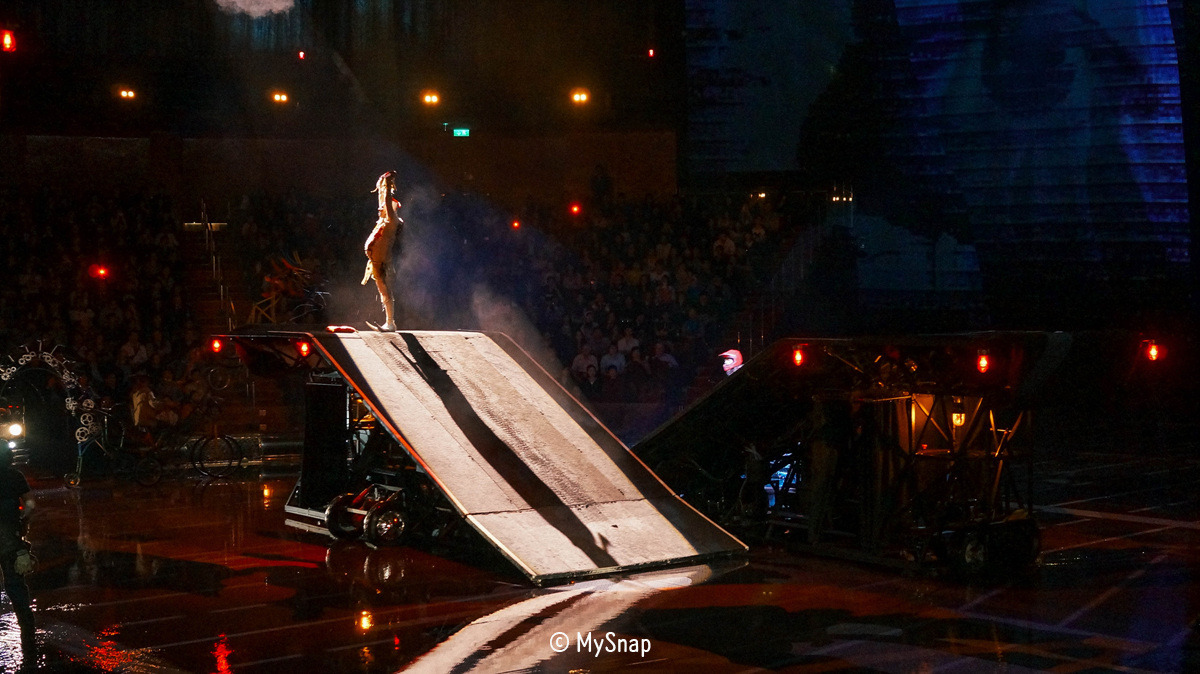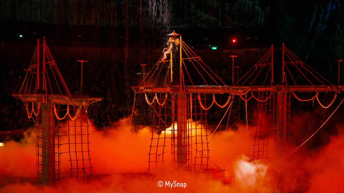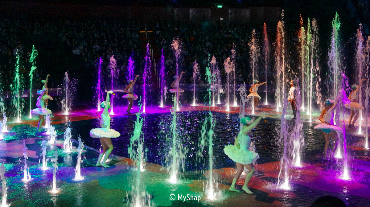 공연 제목처럼 물을 최대한 활용한 퍼포먼스들이 많았는데, 공연이 끝을 향해 달려갈 때는 가득 찬 물을 다 빼고 오토바이를 투입시켜 색다른 퍼포먼스를 보여주는 장면도 매우 인상적이었다. 특히, 엔딩 부분에서 공연을 한 배우들이 상당히 높은 곳에서 물속으로 다이빙하는 순간에는 모든 관람객들이 숨죽이면서 지켜봤다. 아마도, 처음 입장하면서 봤던 공연장 모습 때문에 물속이 깊지 않을 것이란 생각 때문이었을 것이다. 물론, 안전적인 문제는 전혀 없었고 깔끔하게 다이빙에 성공할 때는 우레 같은 박수소리가 쏟아져 나왔다.
