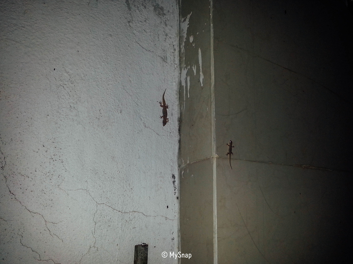 너무 이상해서 방 안의 불을 켰다. 순간 내 눈을 의심할 수밖에 없었다. 숙소 바닥에는 개구리 1마리가 있었고, 벽에는 여러 마리의 도마뱀들이 있었다. 평소 숙소를 들락거리면서 밤이 되면 조명 근처에 모여있는 도마뱀을 자주 봤었다. 아무래도 잠시 환기시킨다고 창문을 열어놓은 곳으로 모르는 사이에 들어온 것 같았다.