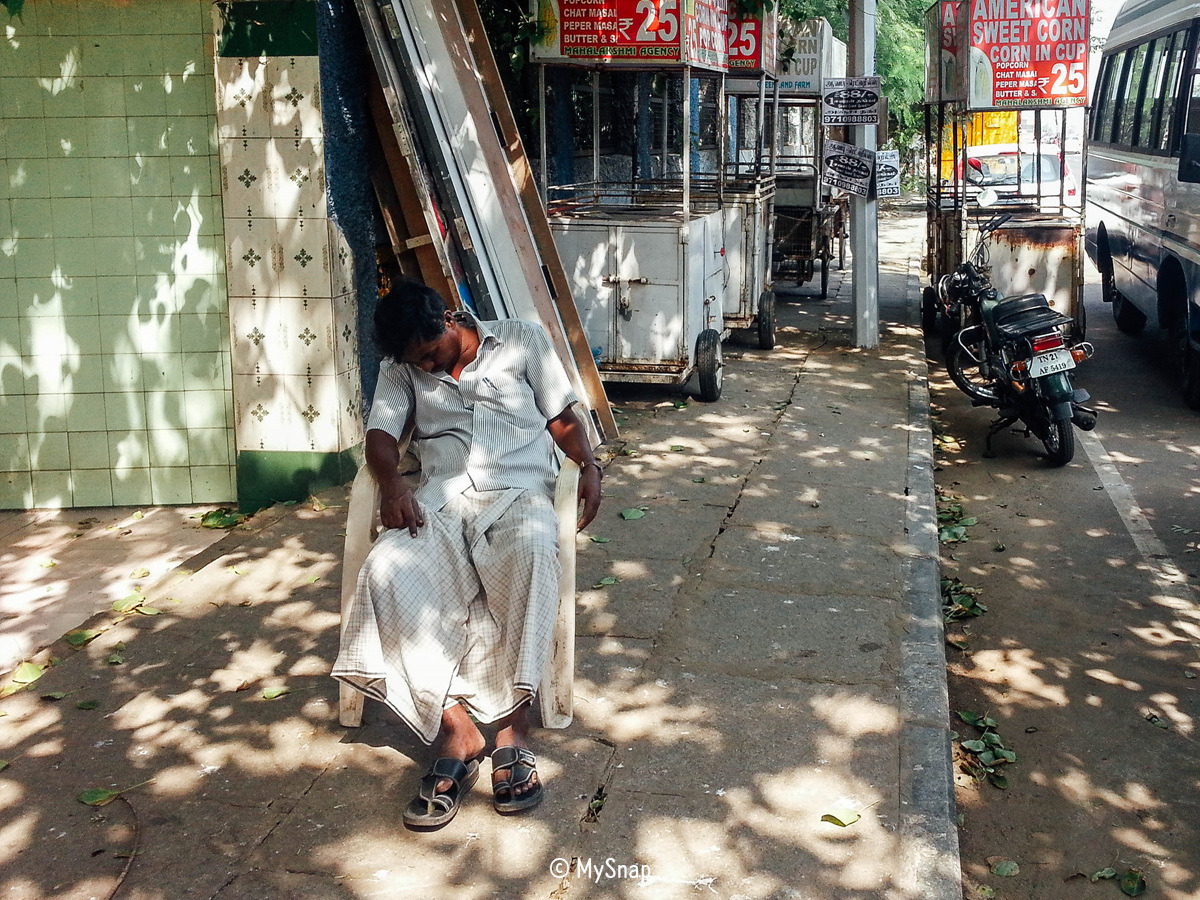 무엇을 할지 고민하는 것보다 그냥 걸으면서 눈에 보이는 것들을 담았다. 너무 지칠 때는 사탕수수 음료를 마시면서 당 보충을 했다. 노점상 옆에서 불편해 보이는 자세로 잠을 자는 현지인을 보니 나도 노곤해지며 더욱더 무기력해진다. 첸나이 거리의 모습을 조금만 담아보고, 숙소로 가서 쉬어야겠다. 무기력함이 나에게 주는 하나의 선물이었다. 이른 일정 종료. 휴식.