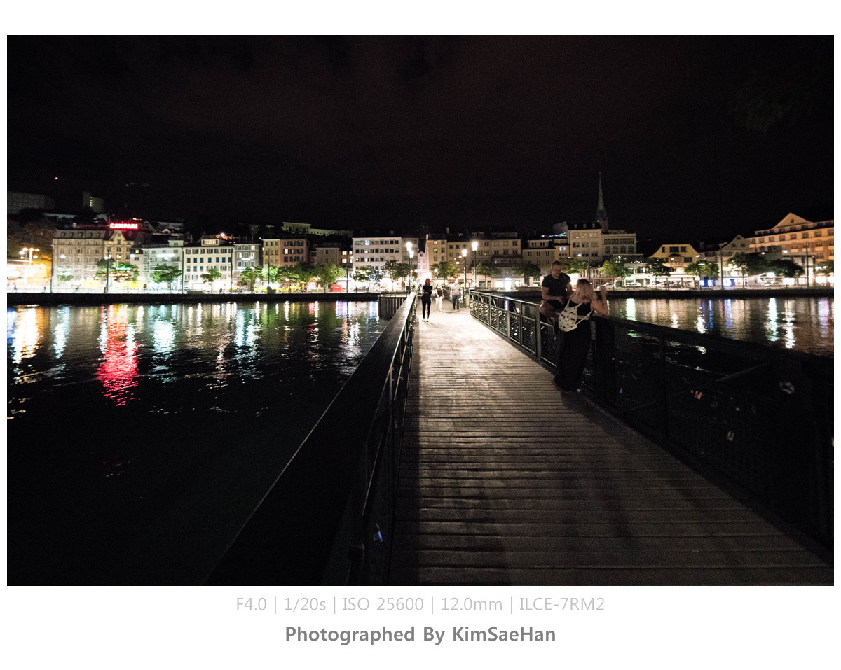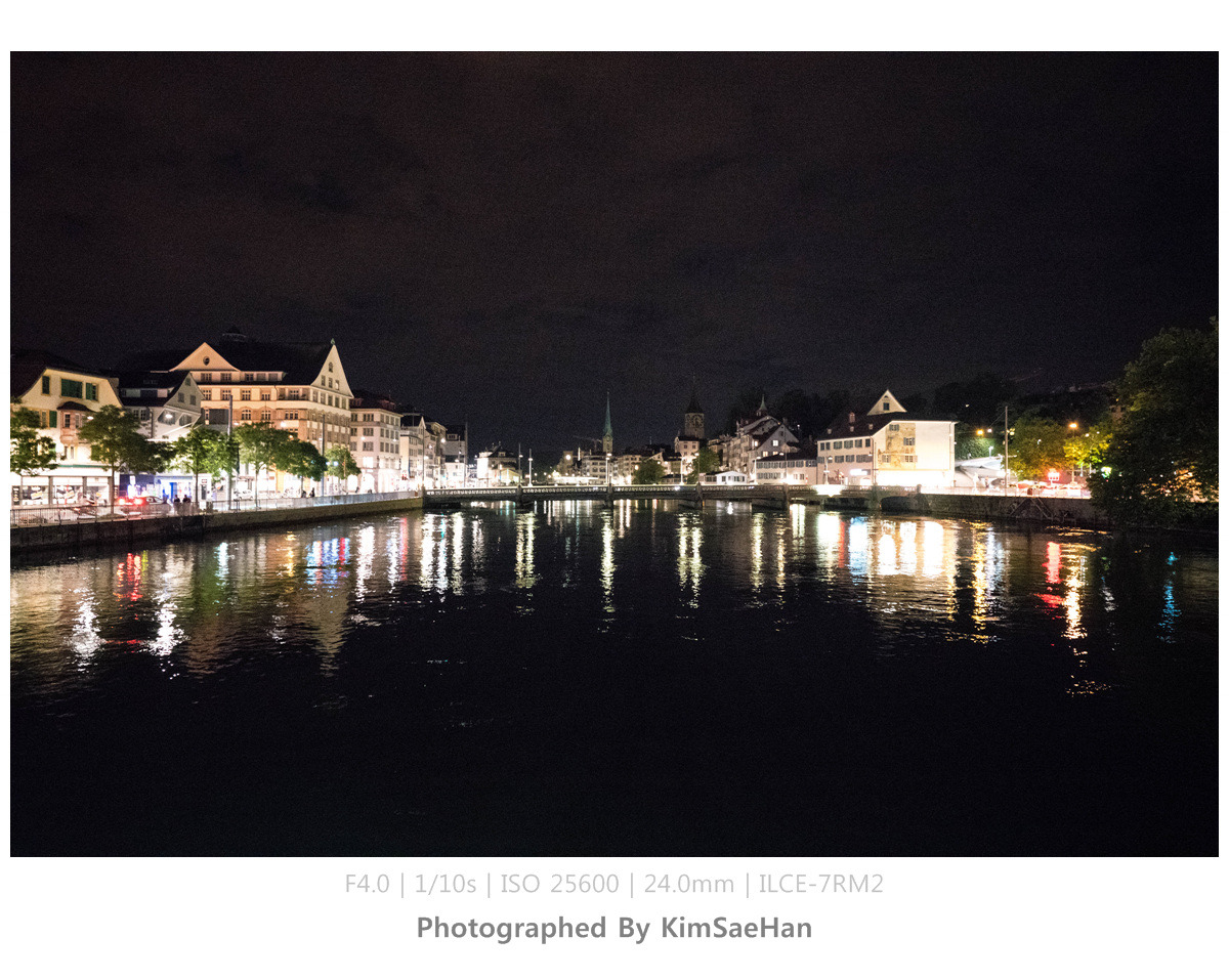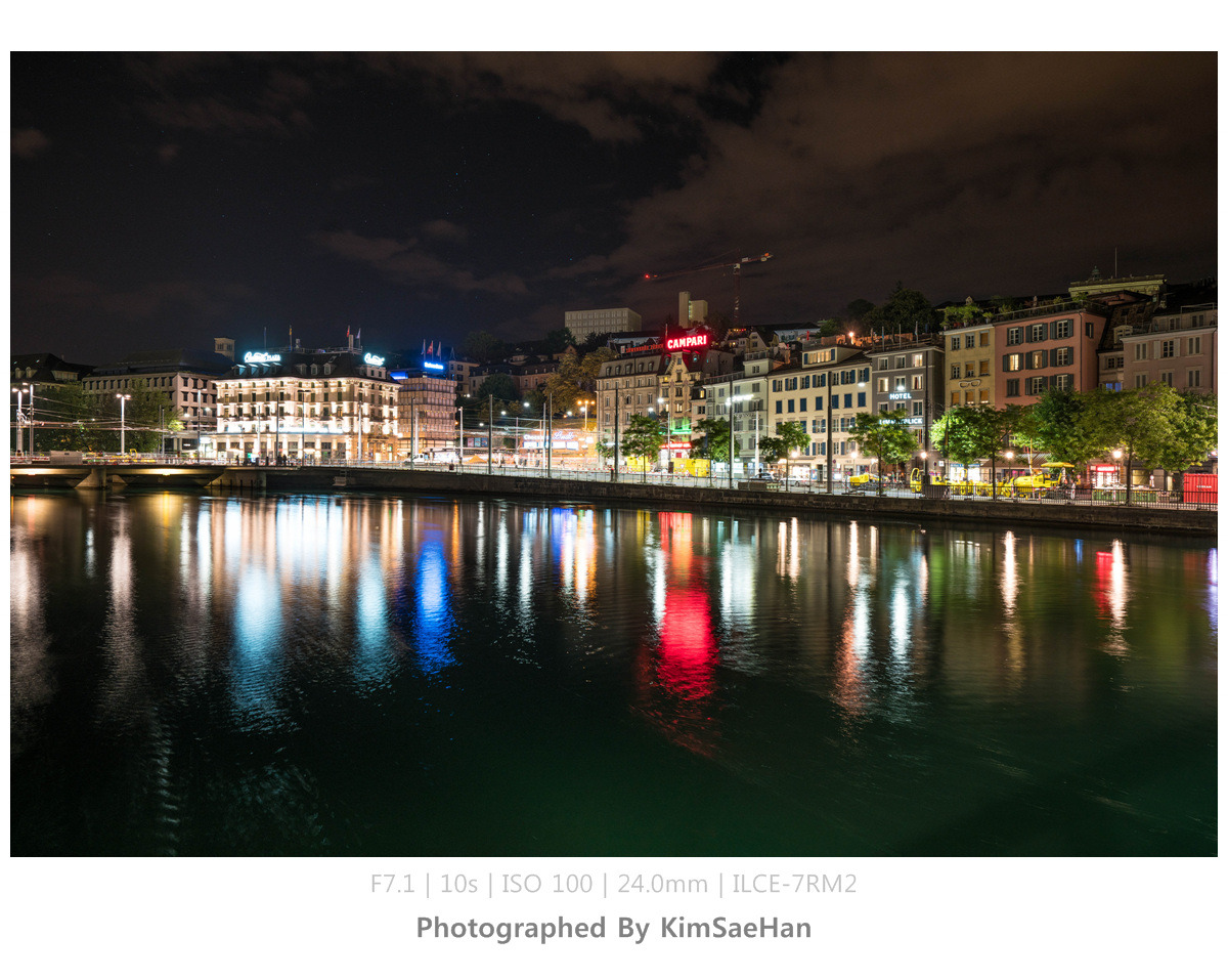 맥주를 마시며, 그냥 들어가기 아쉽다는 얘기를 하며 주변에 강이 있으니까 한번 둘러보고 들어가자고 했다. 취리히 중앙역을 따라 리마트 강까지 천천히 걸으며 이야기도 하고 사진도 찍으며 취리히의 야경을 감상했다. 생각해보니, 여행 일정 중에 취리히는 오늘 하루만 머물기 때문에 야경을 볼 수 있는 시간은 지금밖에 없었다. 그래서 더욱 아쉽기도 해서 천천히 걸으며 가만히 바라보기도 하고, 시원하게 불어오는 강바람도 느끼면서 처음이자 마지막 취리히 밤을 즐겼다.