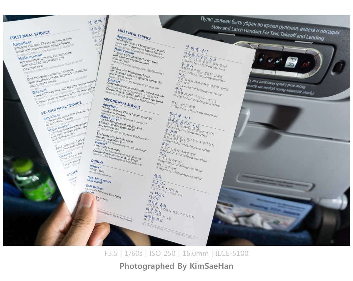 좌석 앞에 메뉴판이 있길래 어떤 것들이 제공되는지 한번 봤는데, 한국어임에도 불구하고 이해가 잘 안 되는 메뉴들이 많았다. 대충 짐작은 되지만 구글 번역기를 돌려서 그런 건지 많이 어색하다. 기내식을 먹는 것은 항상 설렌다. 여행하는 느낌이 들기 때문이다. 두 개밖에 없는 메뉴도 한참을 들여다보며 무엇을 먹을지 고민해본다. 항상 옳은 치킨요리를 먹기로 결정했다.