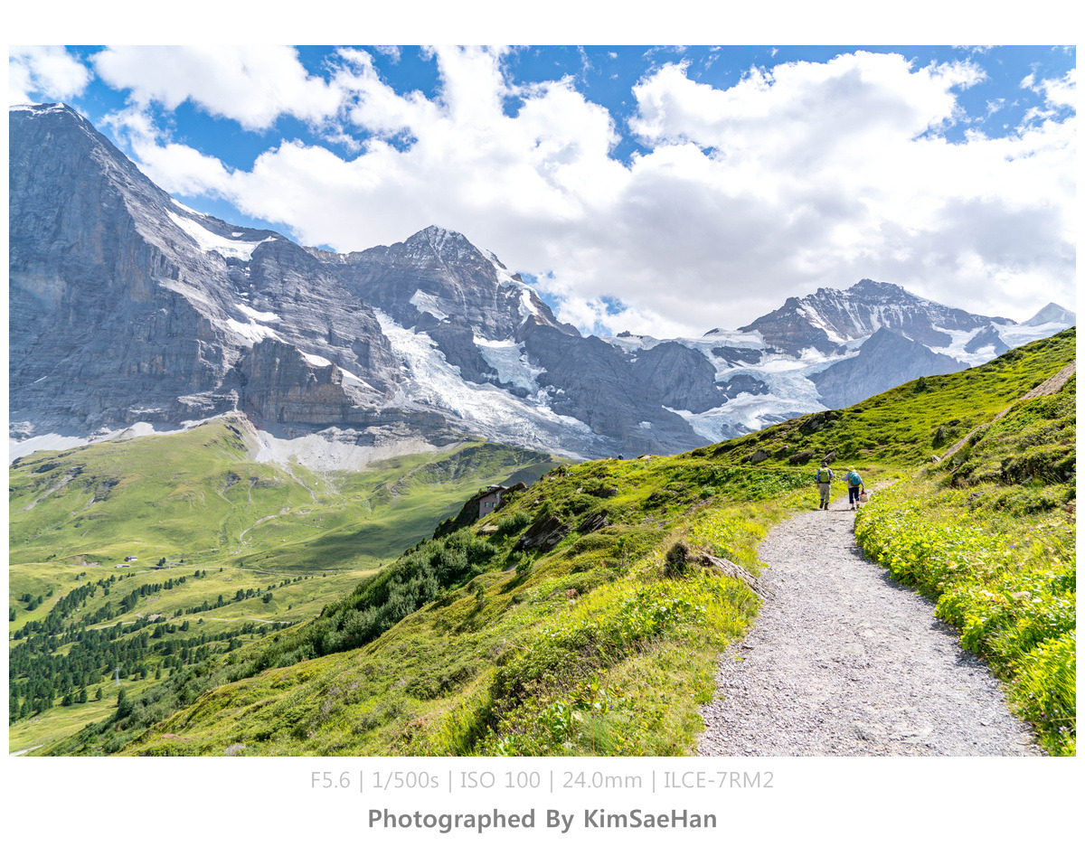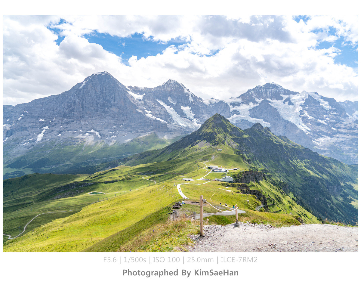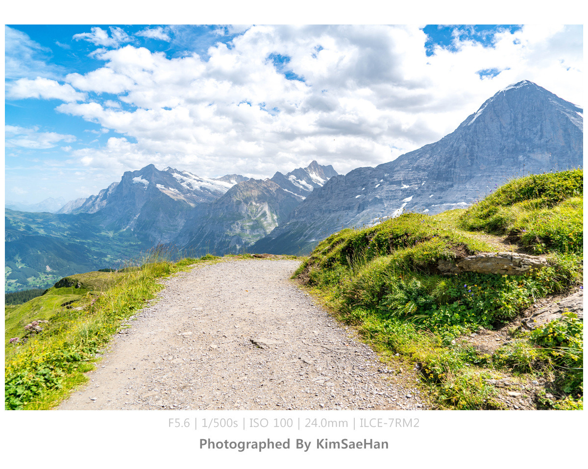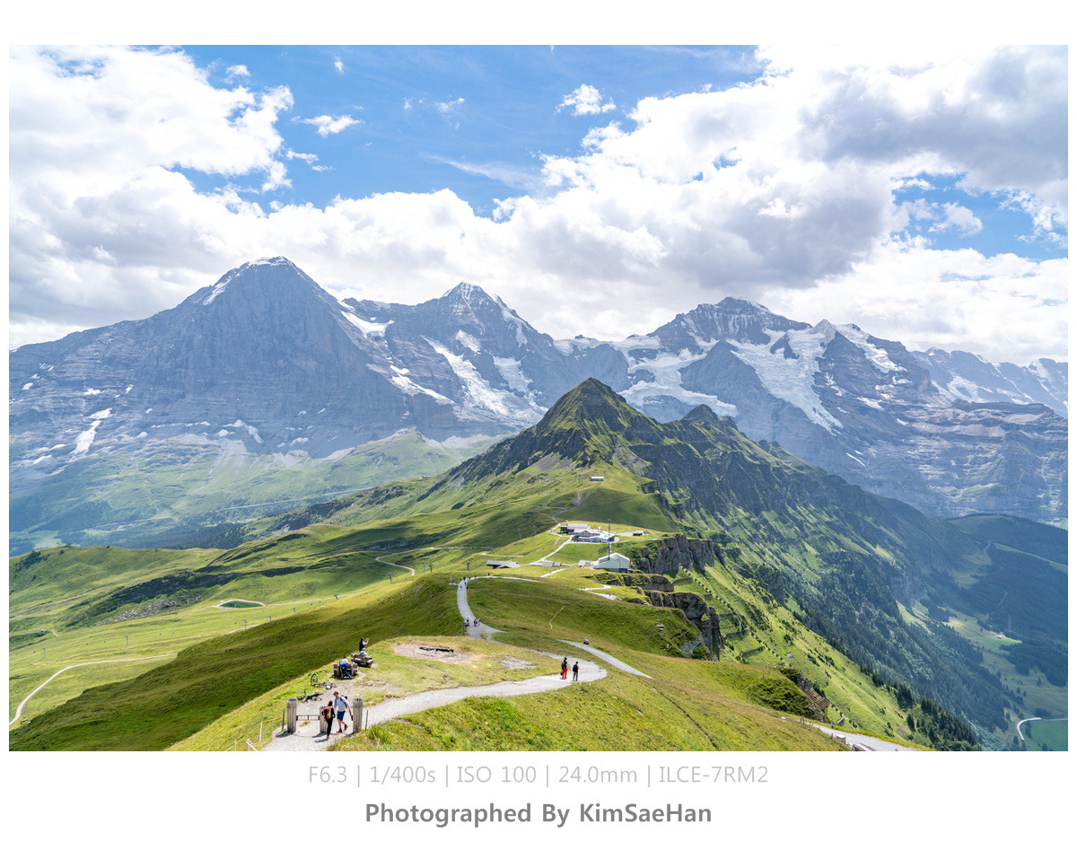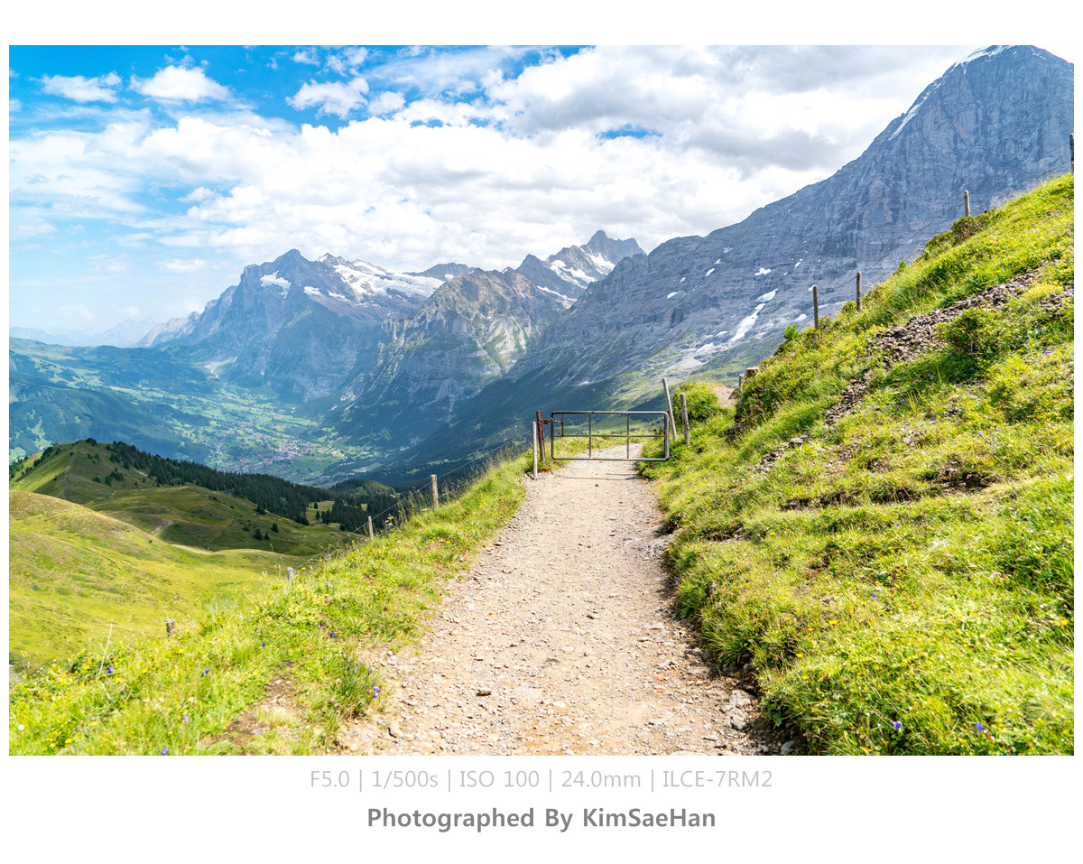 그림 같은 길을 따라 천천히 걸어서 뻥 뚫린 풍경을 바라보며 걷다 보면, 어느새 꼭대기에 도착하게 된다. 고개를 왼쪽으로 돌리면 그린델발트가 보이고, 오른쪽으로 돌리면 벵엔이 보인다. 또 눈 앞에 3개의 봉우리가 보인다. 특히, 융프라우는 장관이다.