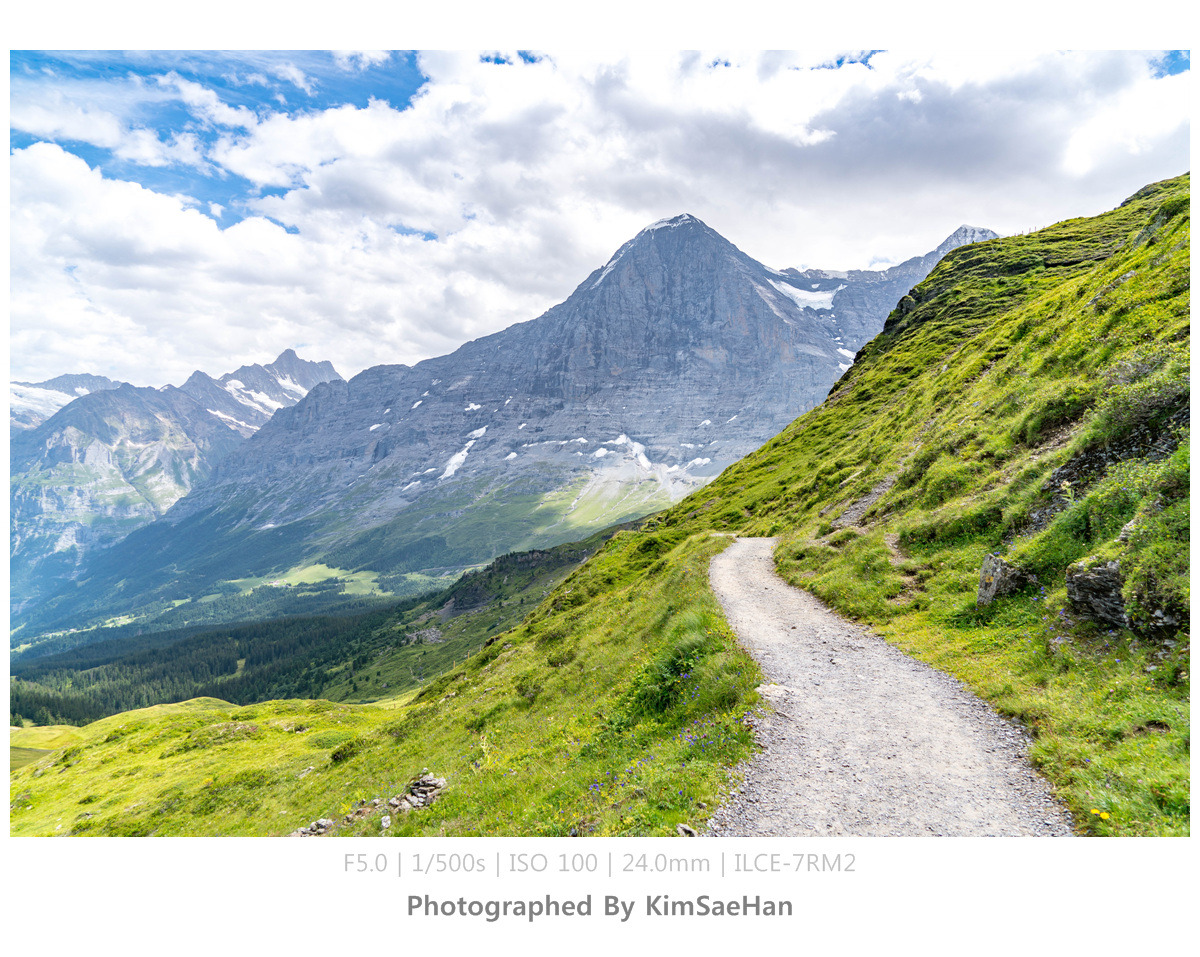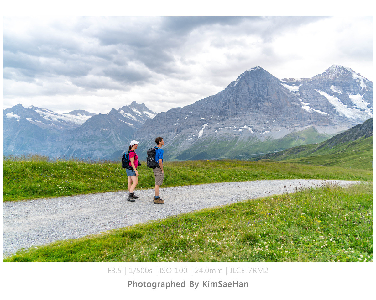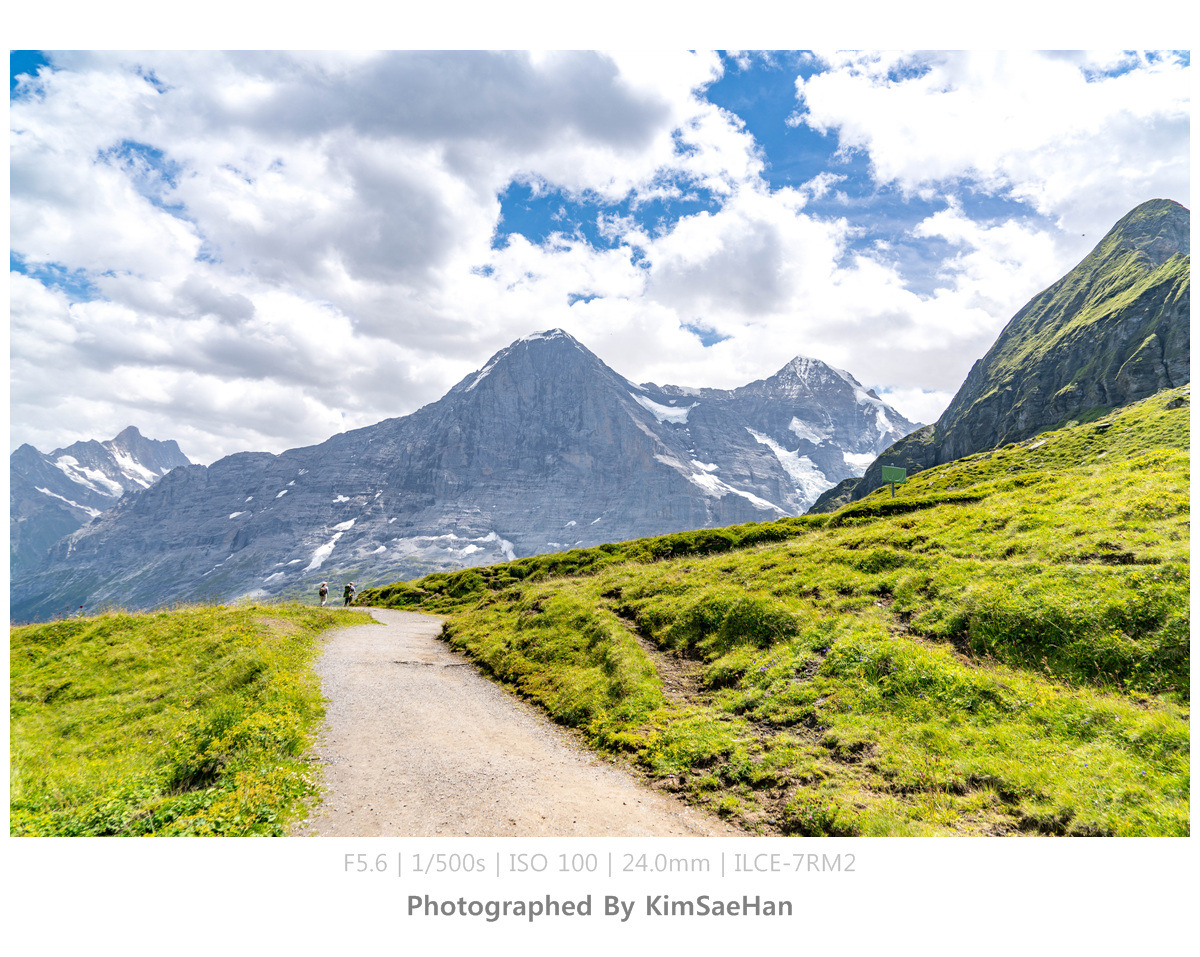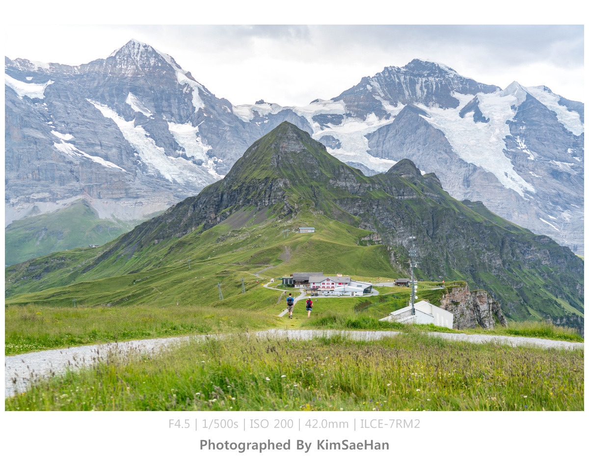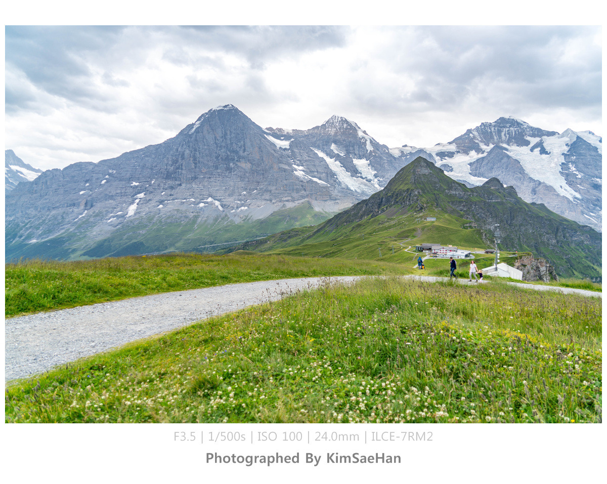 그림 같은 길을 따라 천천히 걸어서 뻥 뚫린 풍경을 바라보며 걷다 보면, 어느새 꼭대기에 도착하게 된다. 고개를 왼쪽으로 돌리면 그린델발트가 보이고, 오른쪽으로 돌리면 벵엔이 보인다. 또 눈 앞에 3개의 봉우리가 보인다. 특히, 융프라우는 장관이다.
