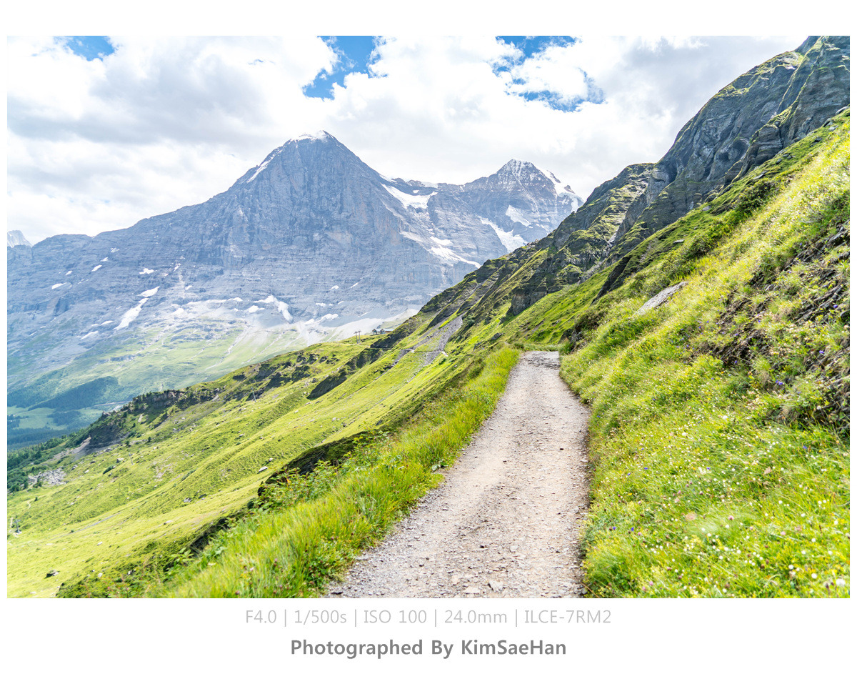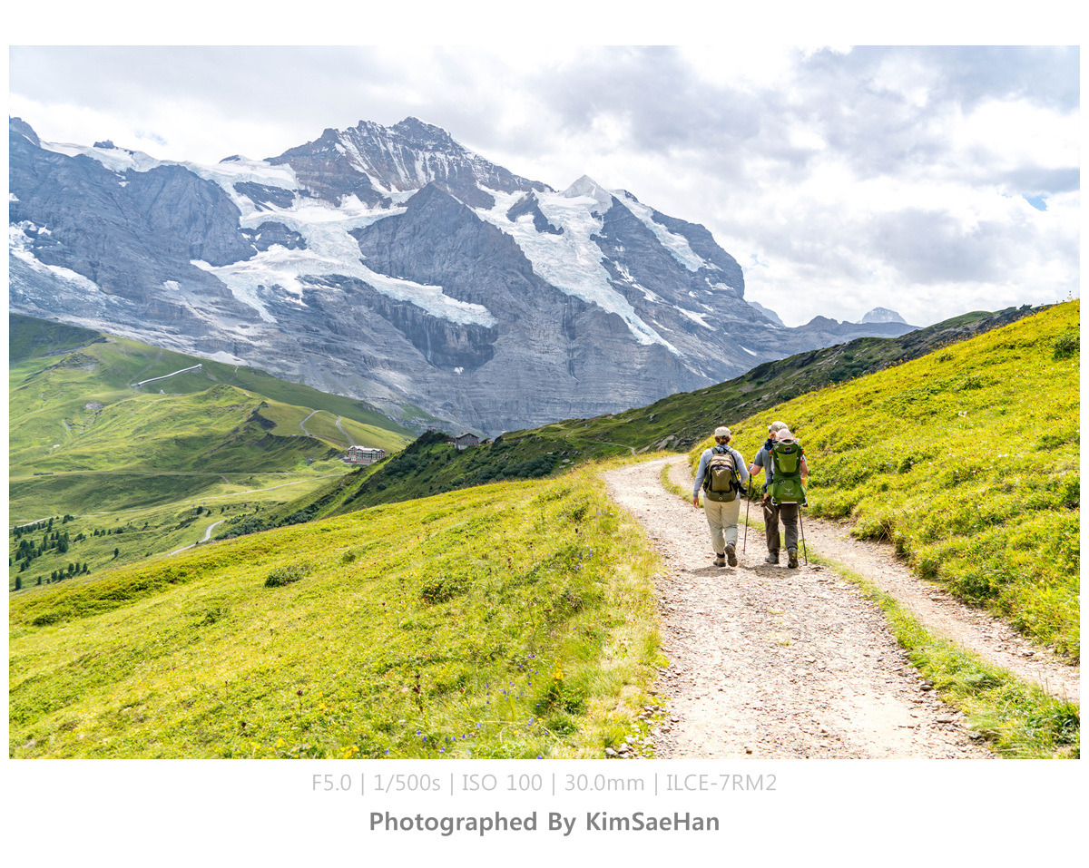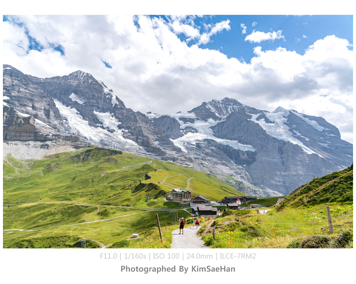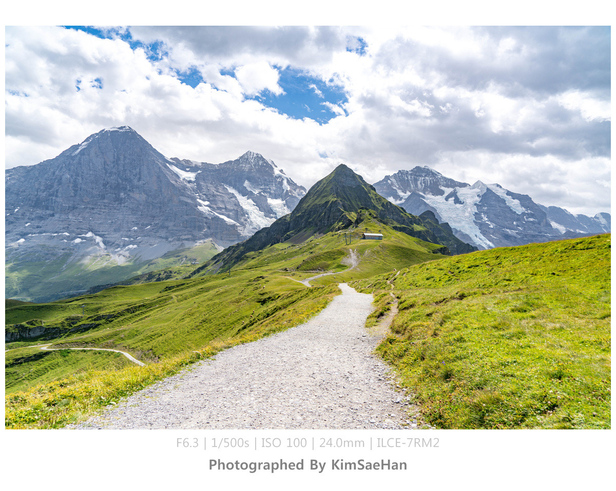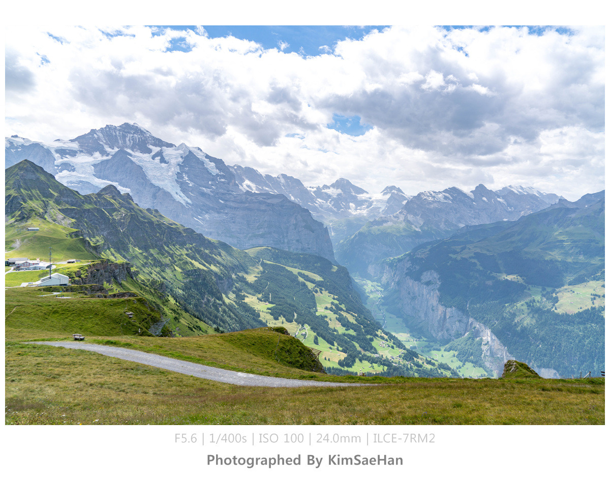 그림 같은 길을 따라 천천히 걸어서 뻥 뚫린 풍경을 바라보며 걷다 보면, 어느새 꼭대기에 도착하게 된다. 고개를 왼쪽으로 돌리면 그린델발트가 보이고, 오른쪽으로 돌리면 벵엔이 보인다. 또 눈 앞에 3개의 봉우리가 보인다. 특히, 융프라우는 장관이다.