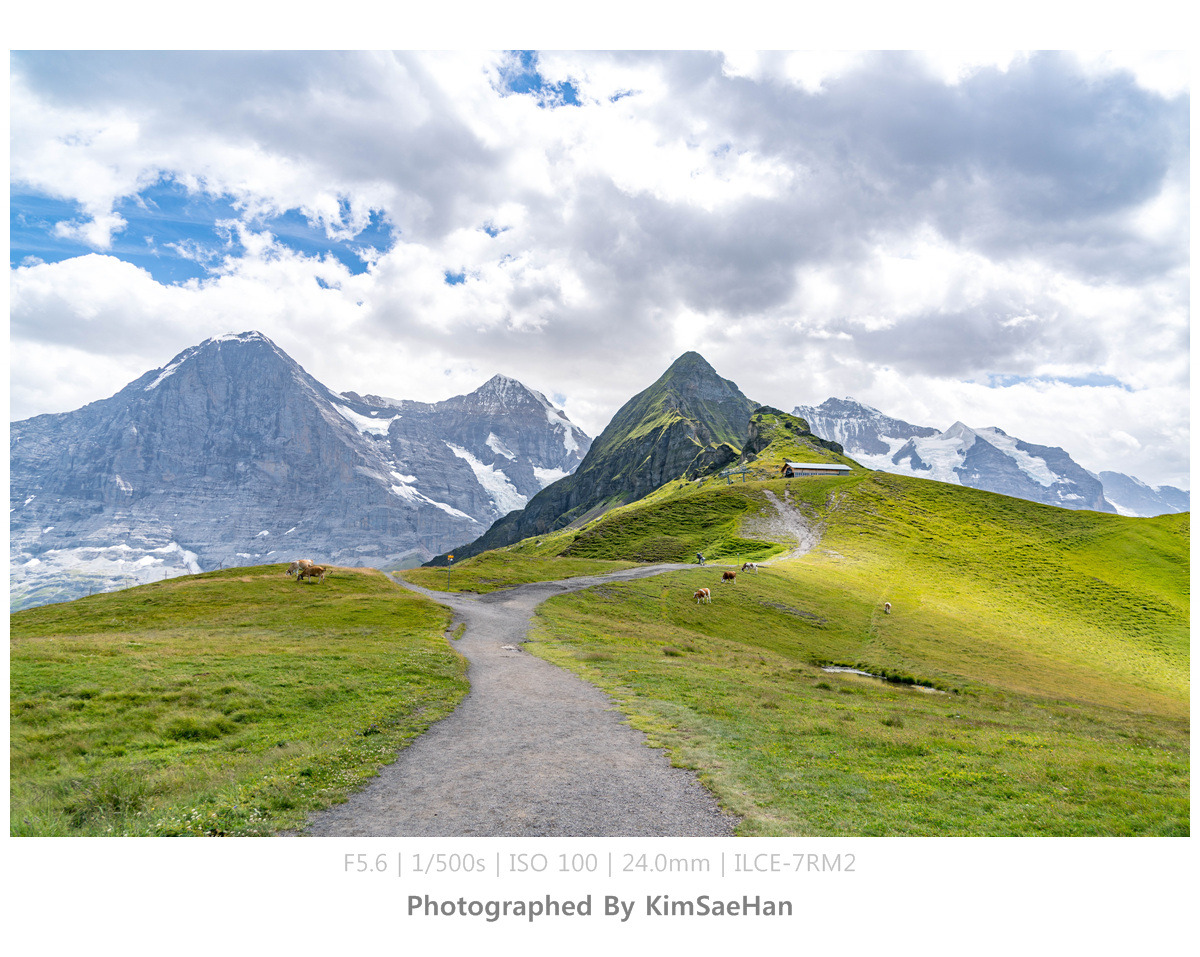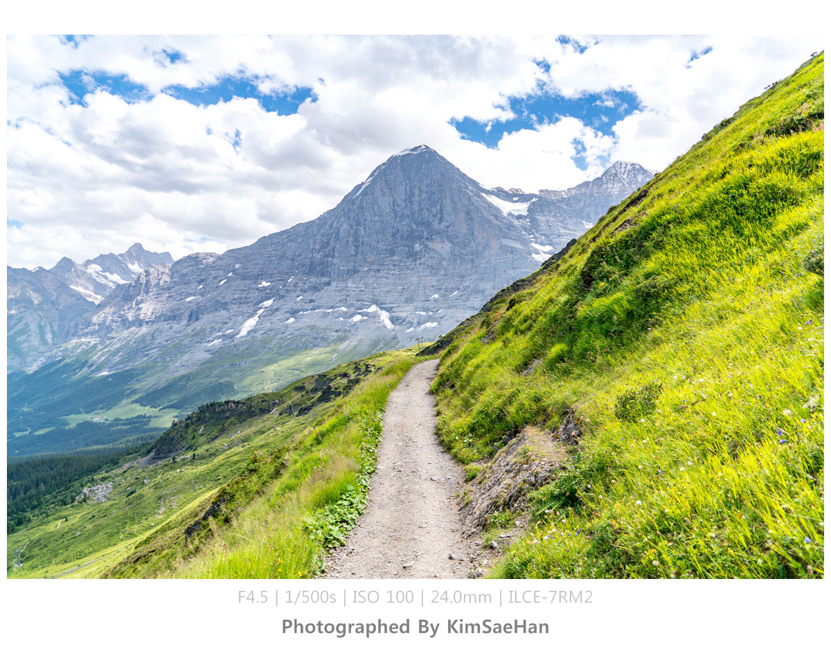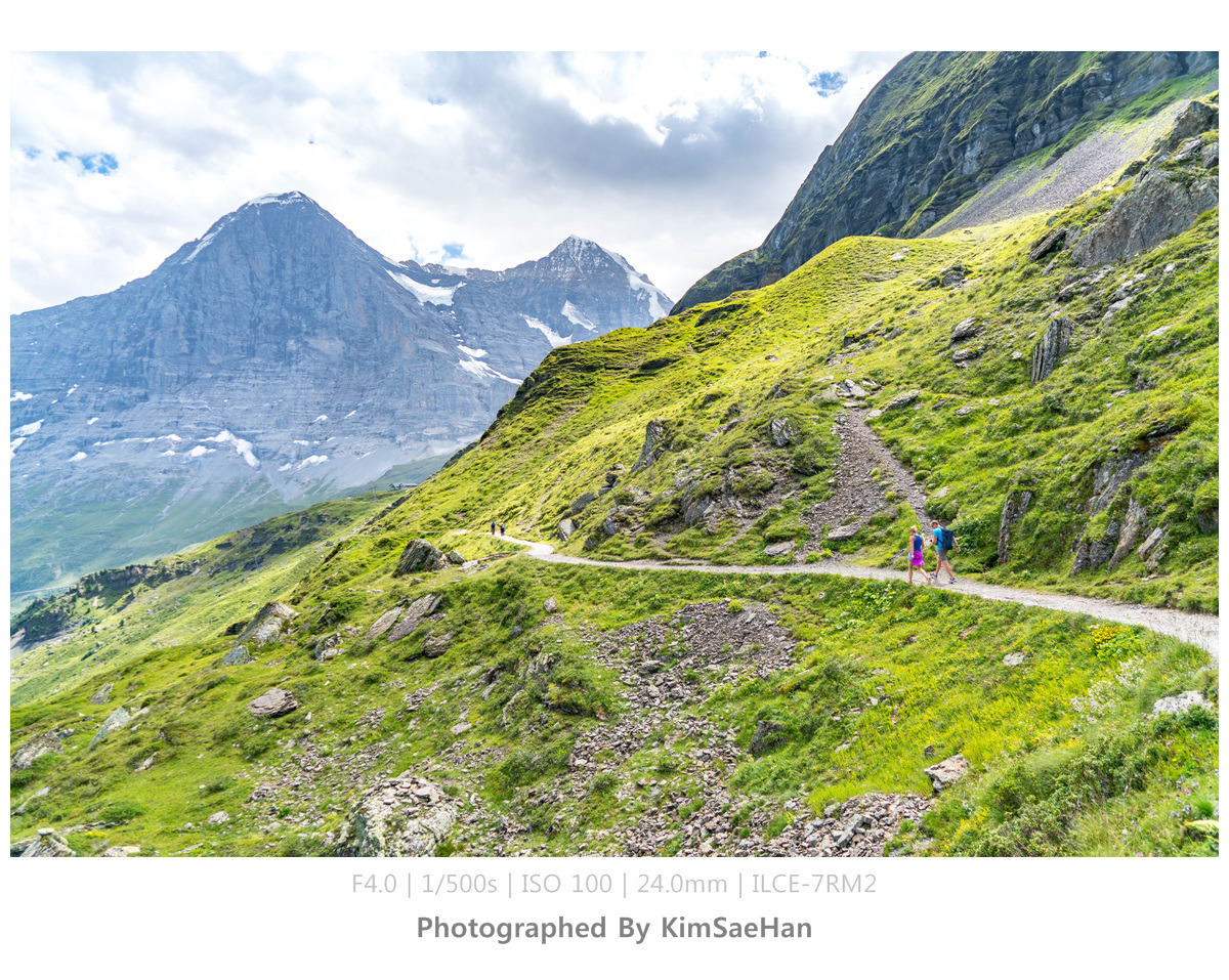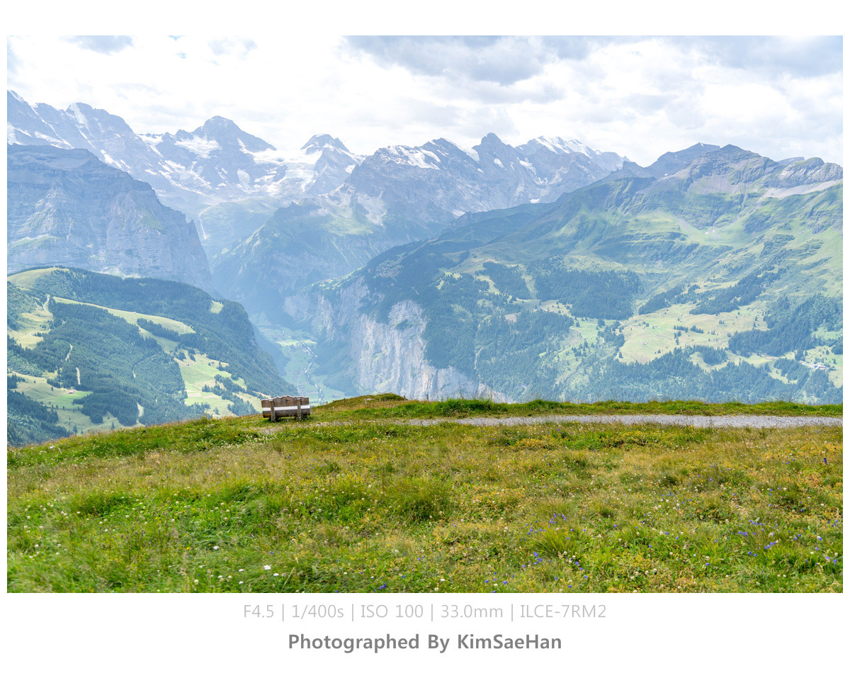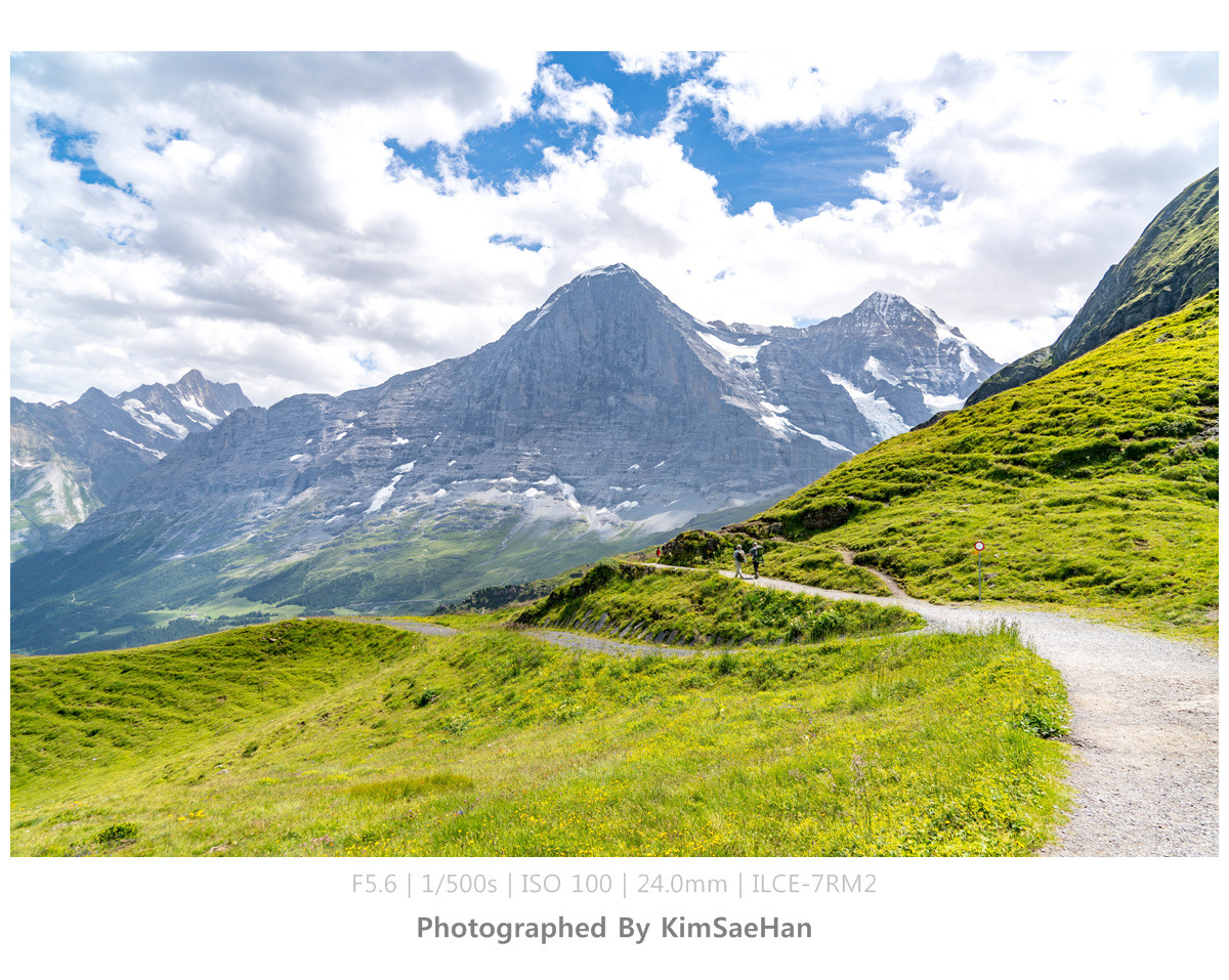 그림 같은 길을 따라 천천히 걸어서 뻥 뚫린 풍경을 바라보며 걷다 보면, 어느새 꼭대기에 도착하게 된다. 고개를 왼쪽으로 돌리면 그린델발트가 보이고, 오른쪽으로 돌리면 벵엔이 보인다. 또 눈 앞에 3개의 봉우리가 보인다. 특히, 융프라우는 장관이다.