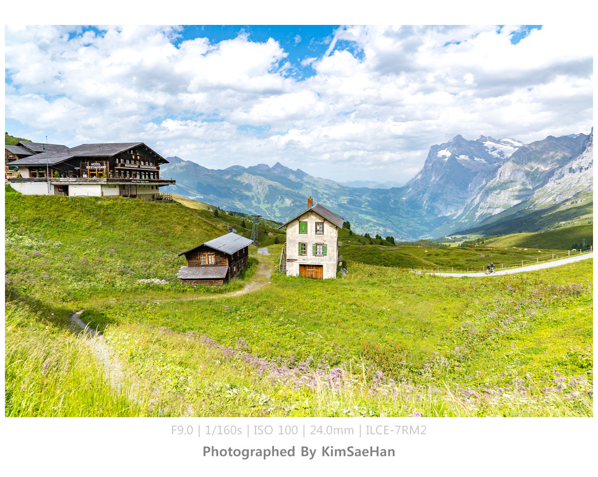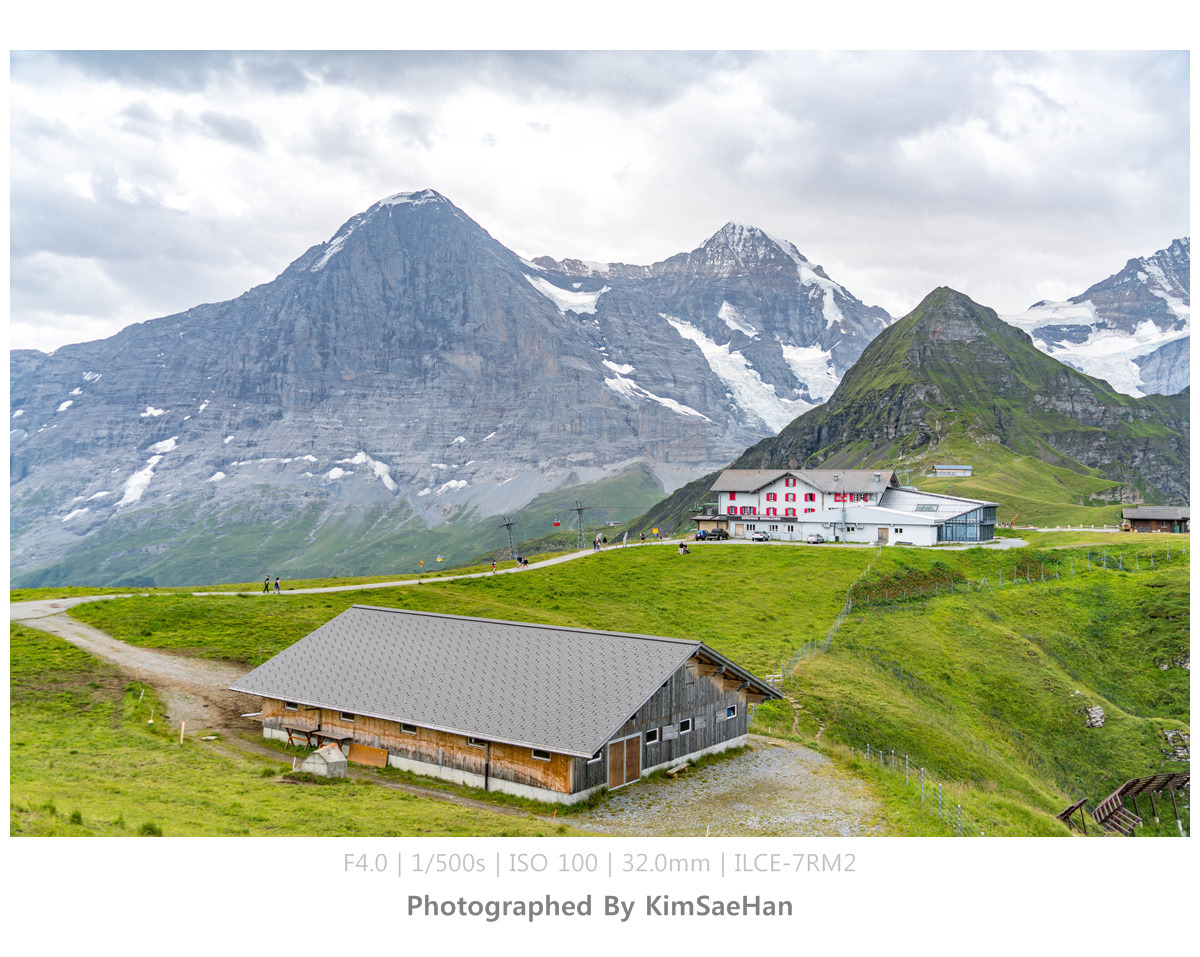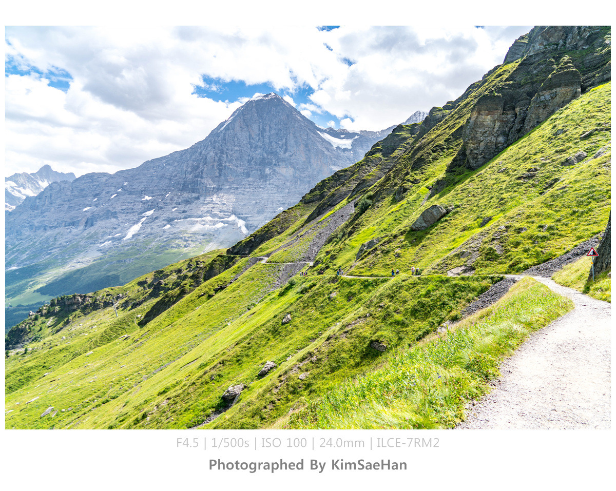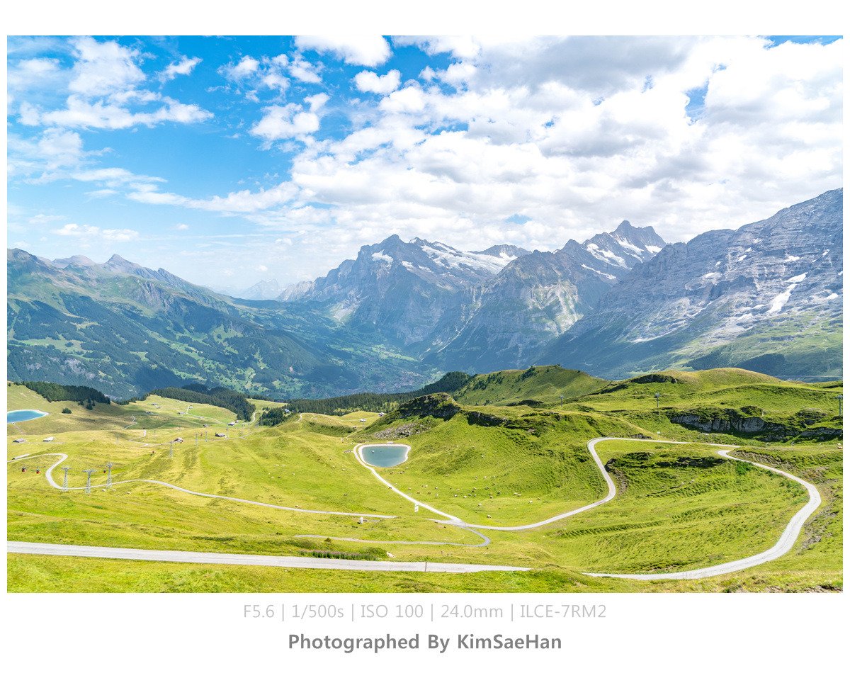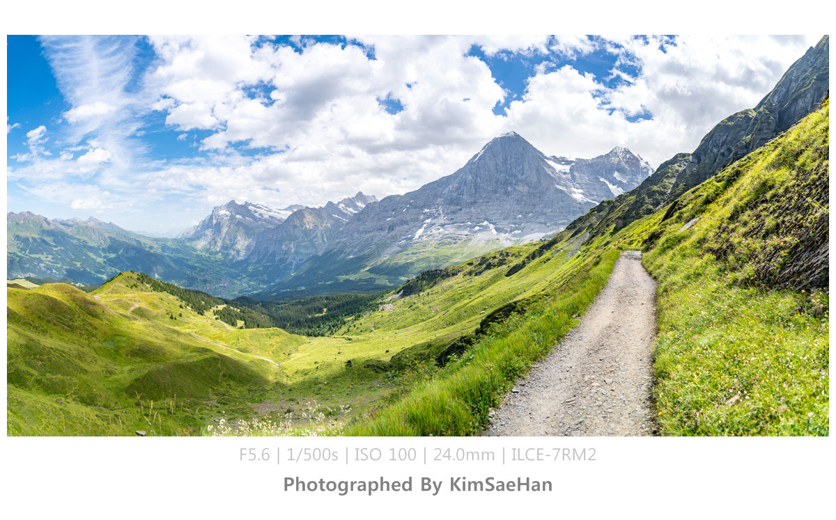그림 같은 길을 따라 천천히 걸어서 뻥 뚫린 풍경을 바라보며 걷다 보면, 어느새 꼭대기에 도착하게 된다. 고개를 왼쪽으로 돌리면 그린델발트가 보이고, 오른쪽으로 돌리면 벵엔이 보인다. 또 눈 앞에 3개의 봉우리가 보인다. 특히, 융프라우는 장관이다.