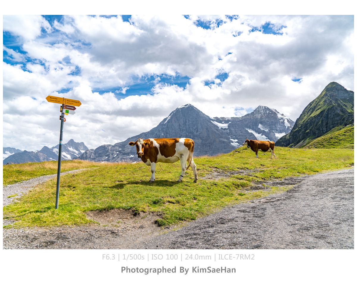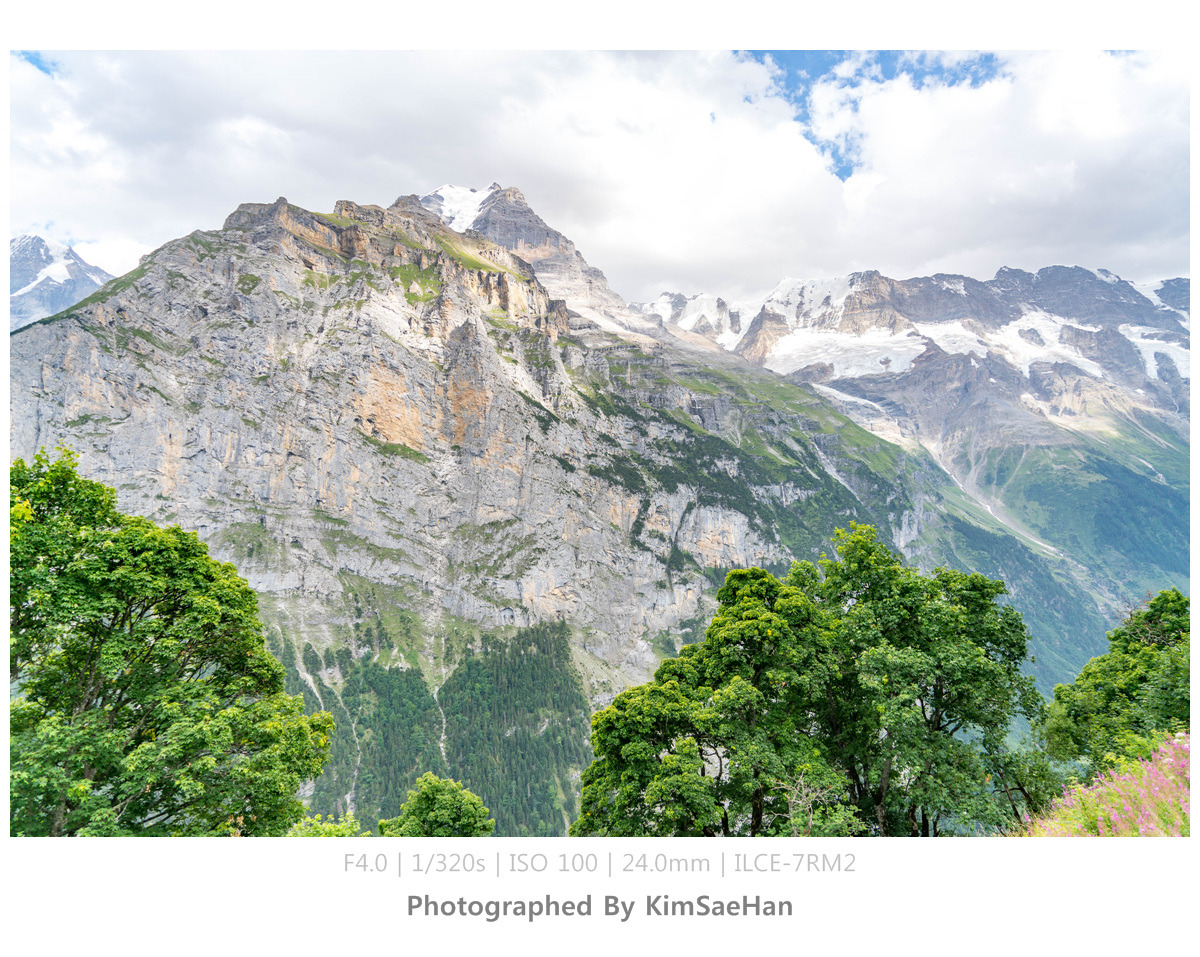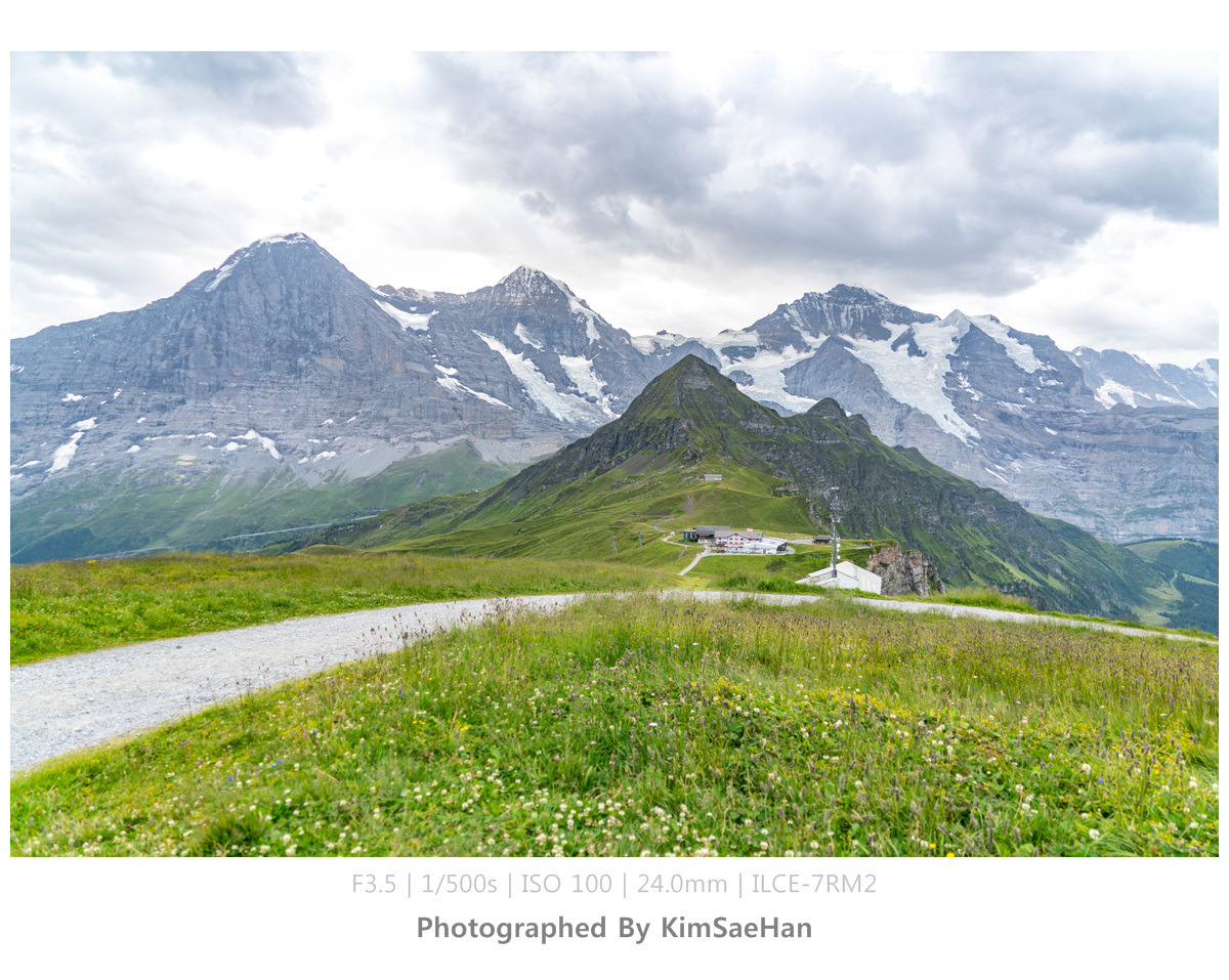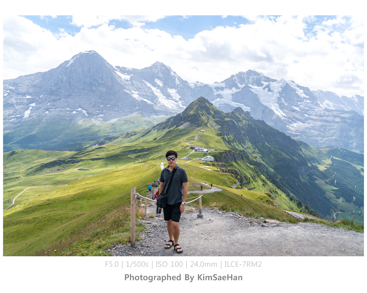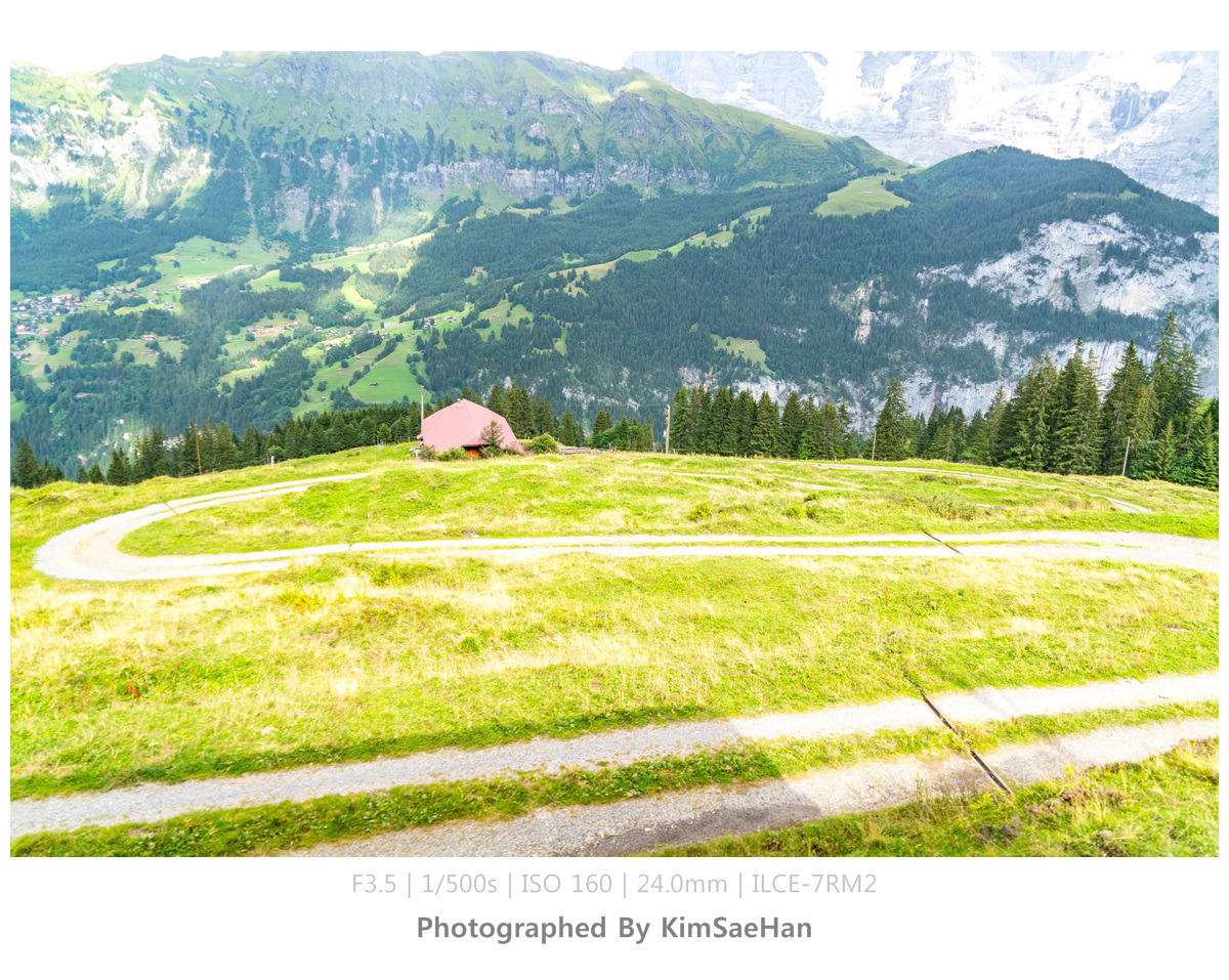 그림 같은 길을 따라 천천히 걸어서 뻥 뚫린 풍경을 바라보며 걷다 보면, 어느새 꼭대기에 도착하게 된다. 고개를 왼쪽으로 돌리면 그린델발트가 보이고, 오른쪽으로 돌리면 벵엔이 보인다. 또 눈 앞에 3개의 봉우리가 보인다. 특히, 융프라우는 장관이다.